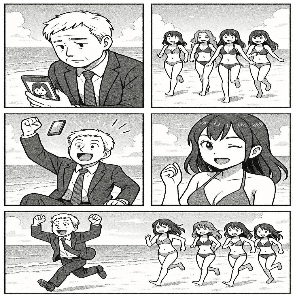 スーツ姿の年配男性と、ビーチで彼を追いかける若い女性たちという構図は、「男性は仕事やお金で価値があり、女性は見た目で価値がある」というジェンダーステレオタイプを強化するような考えを社会に広めてしまう内容と判断されました。