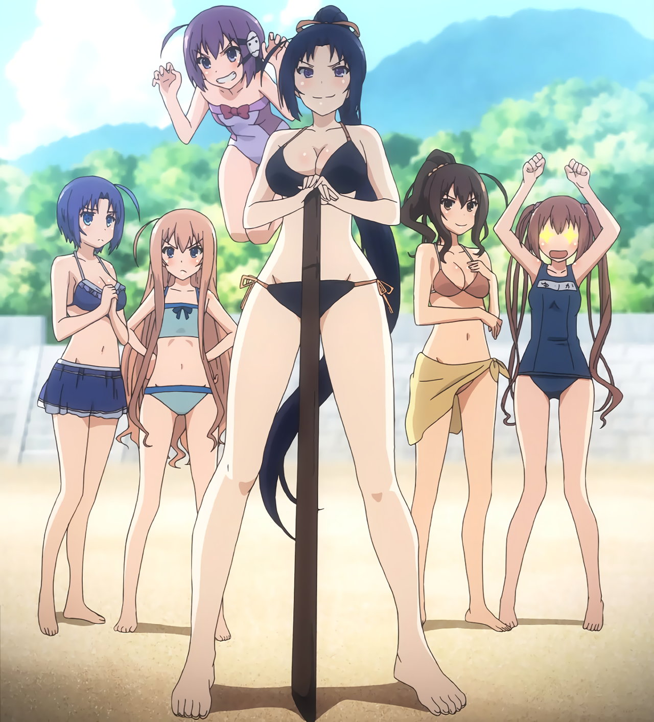 水着姿の早苗、ティアミリス、ルースカニア、キリハ、ゆりか、静香。