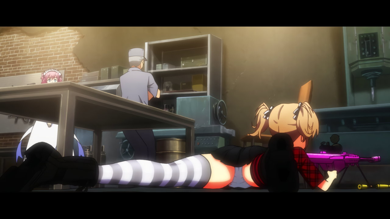 パンチラしながら狙撃銃を伏せ撃ちする蒔菜。