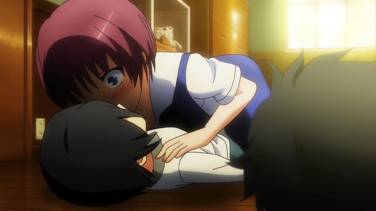 転んだ弾みで雄二を押し倒し、キスするたまき。