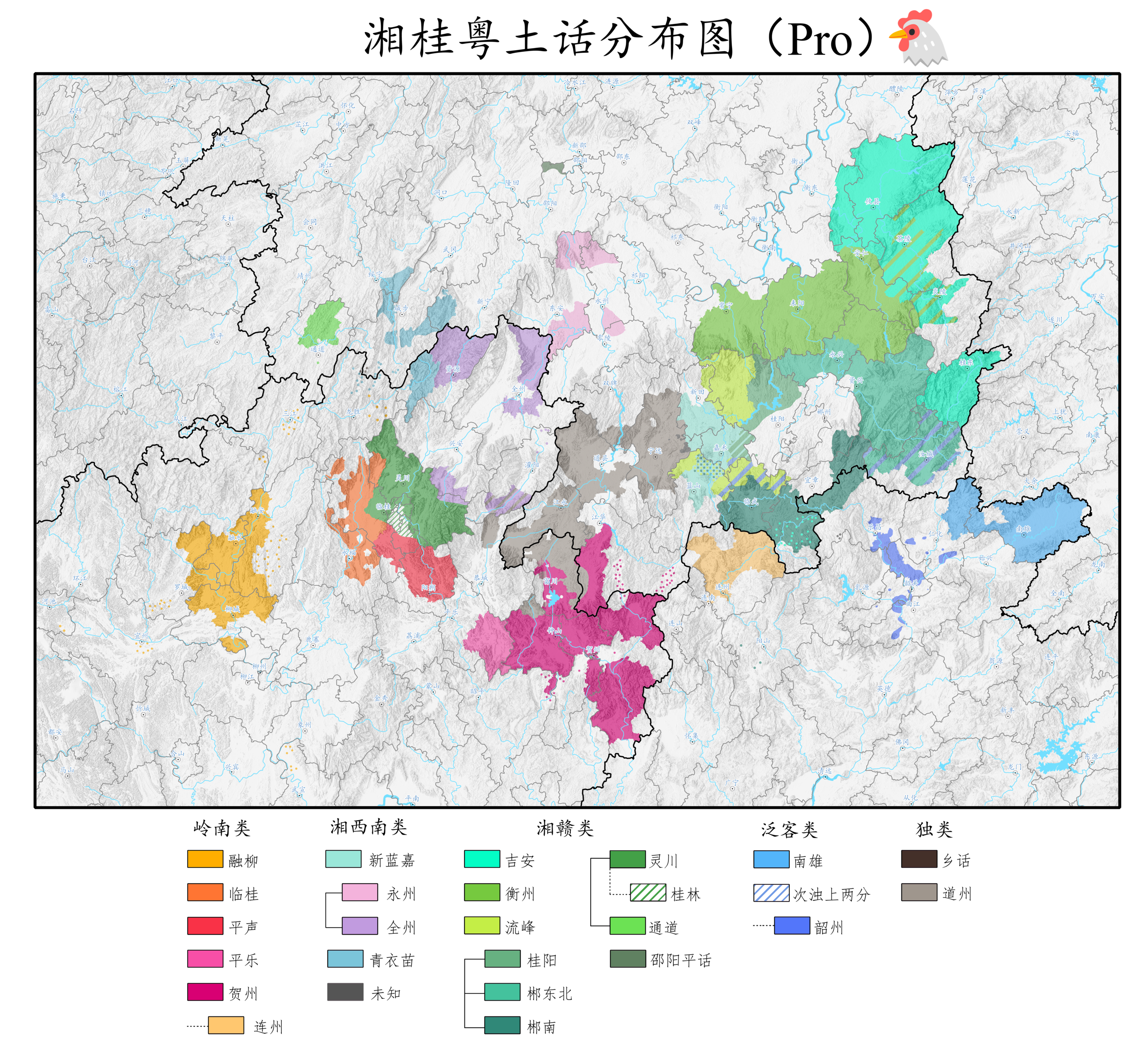 本片划分有些随意,主要参考衣品老师的 一种划分湖南省湘语的24小片方案 以及 【专题】桂林市桂北平话分布及语音概况 ,以因拆尽拆的原则进行拆分重组。由于湘赣类过于相似,争议较大,我只挑重点。