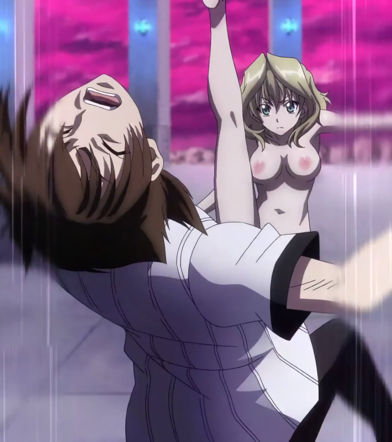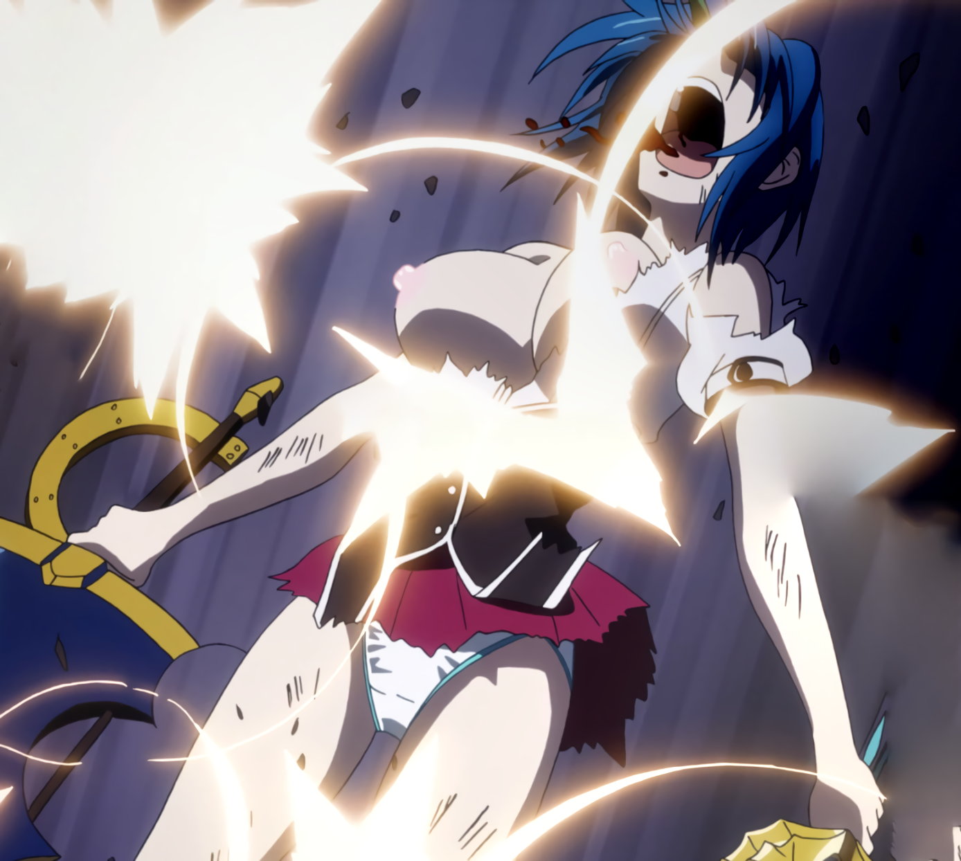 被弾して制服が破れ、乳首・下着を露出させるゼノヴィア。