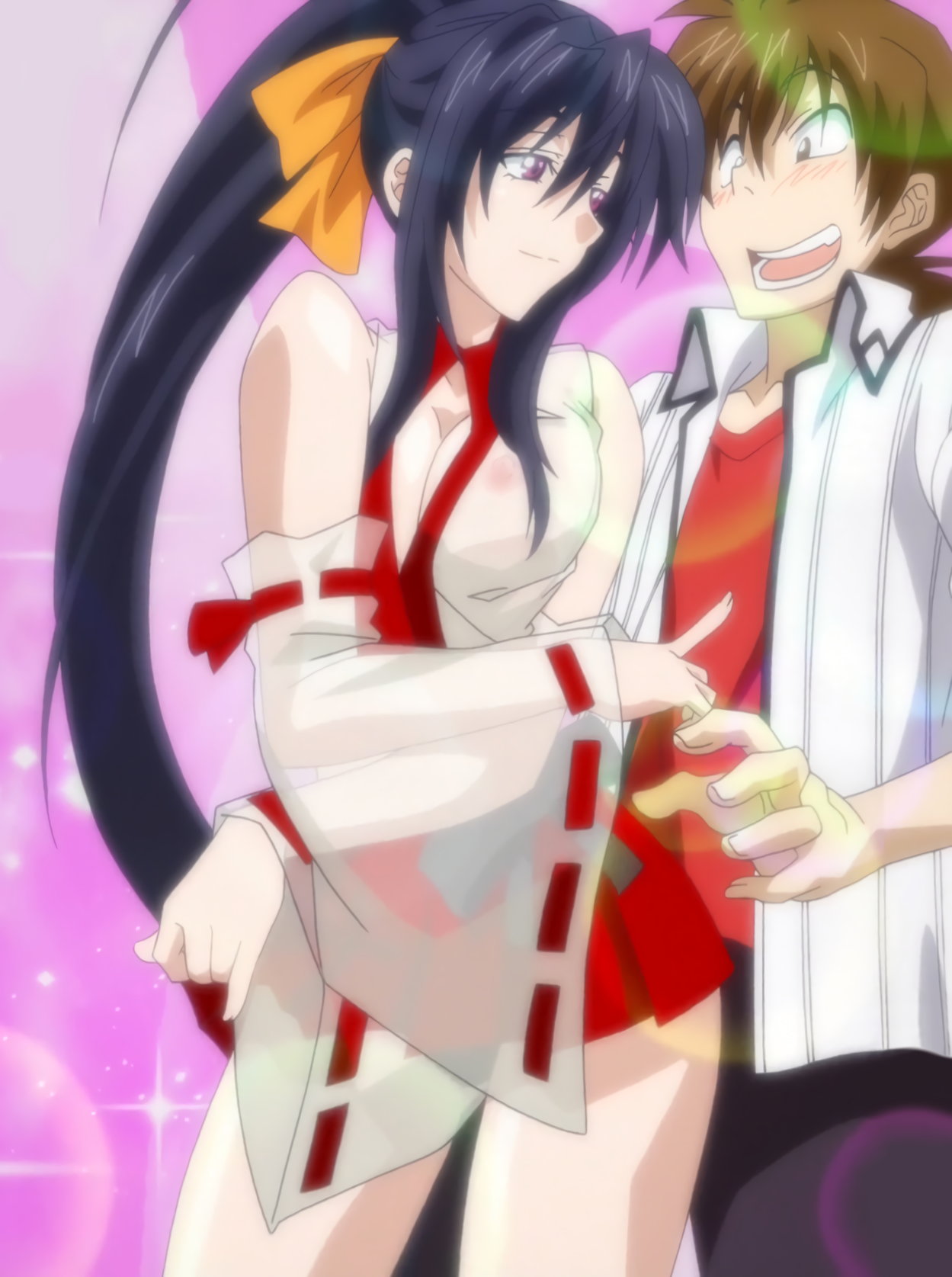 上着とブラジャーを脱ぎ、上半身裸になる朱乃。一誠の手を取り、パイタッチさせる。