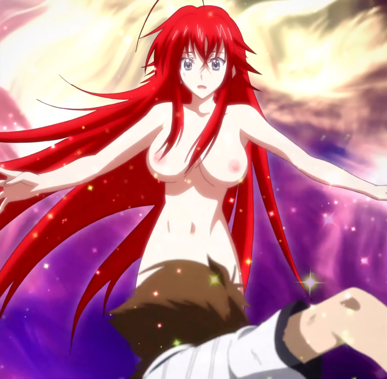 戦闘中に制服が破れ、上半身裸状態のリアス。