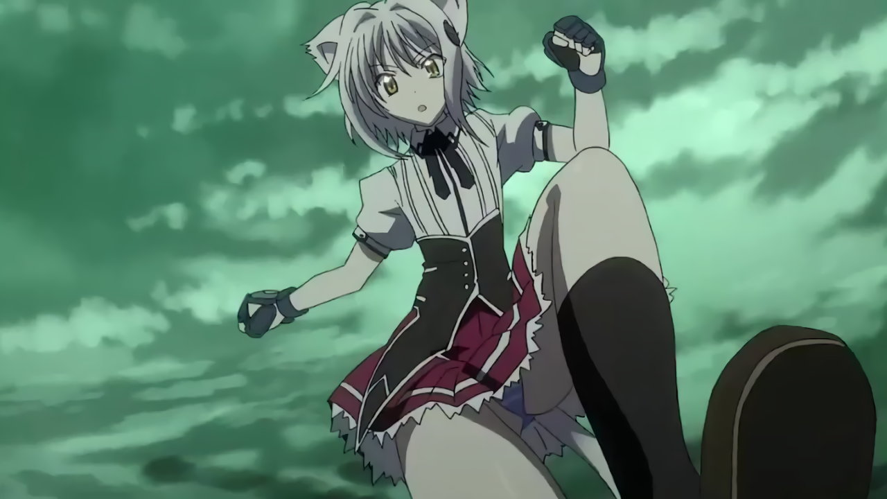 敵を蹴り飛ばし、パンチラする小猫。