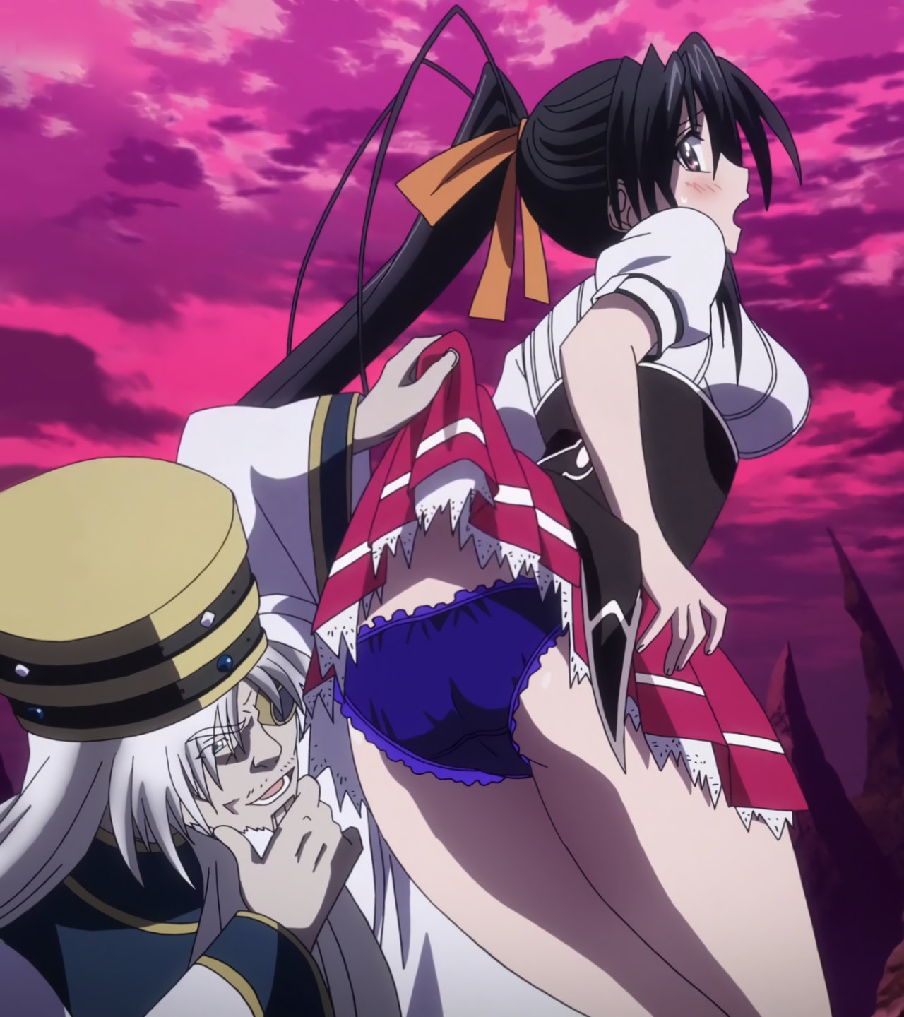 朱乃のスカートを捲り、パンツと臀部を観察するオーディン。