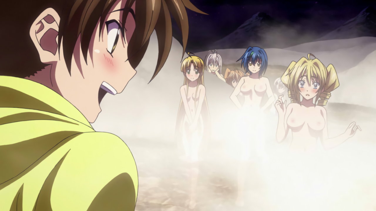 温泉に突入し、リアスたちと遭遇する一誠。