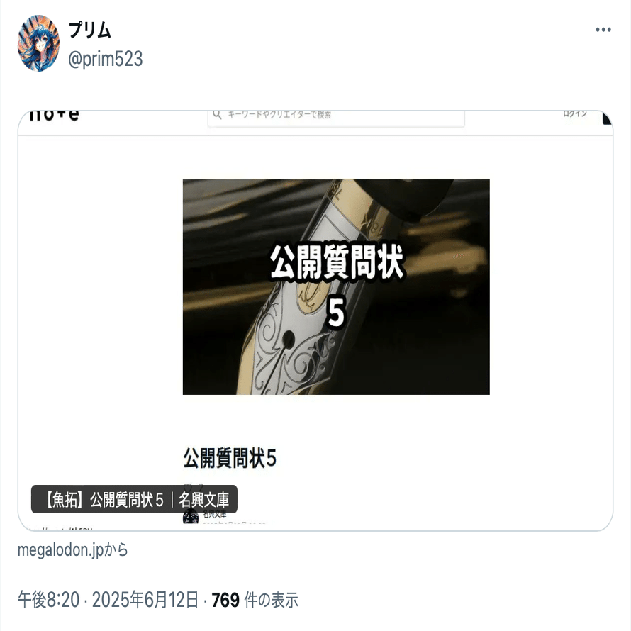 名興文庫は2025年6月12日18時33分、プリム(@prim523)に対し公開質問を行い、プリムのnoteアカウントで回答するよう要求した。