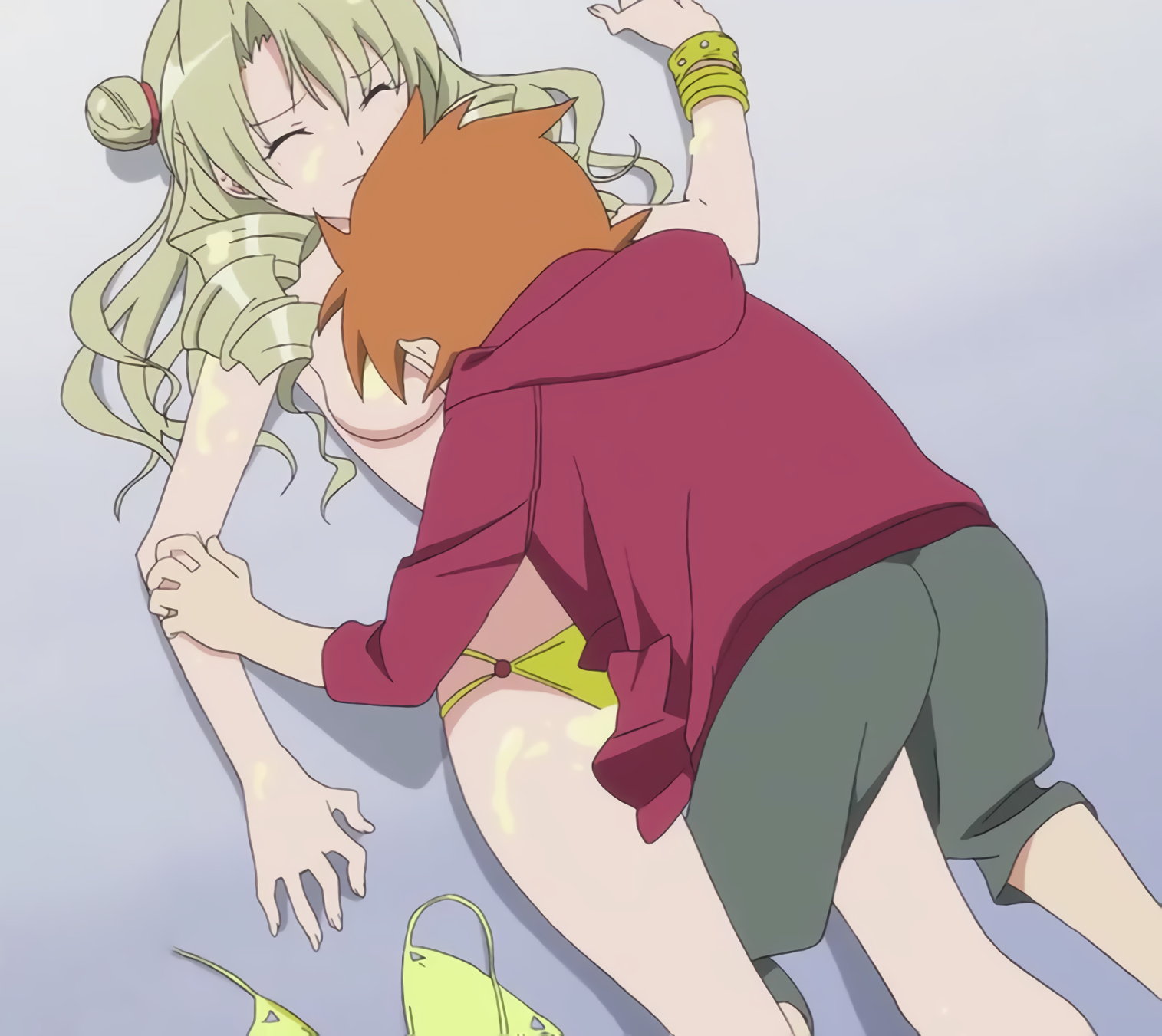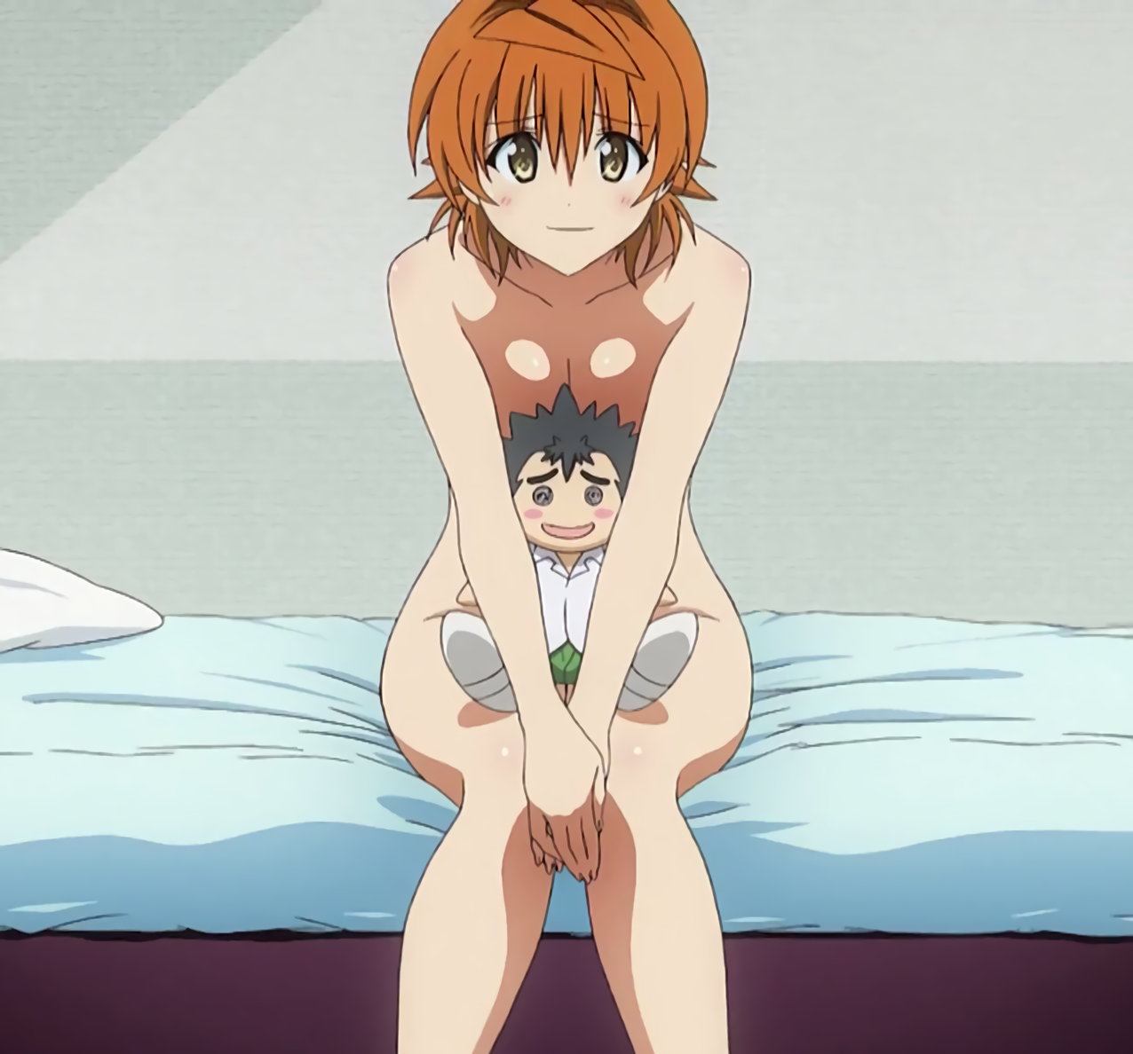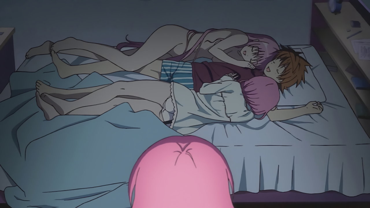 リトに密着しながら眠る、全裸のララおよびパンツ丸出しのモモ。