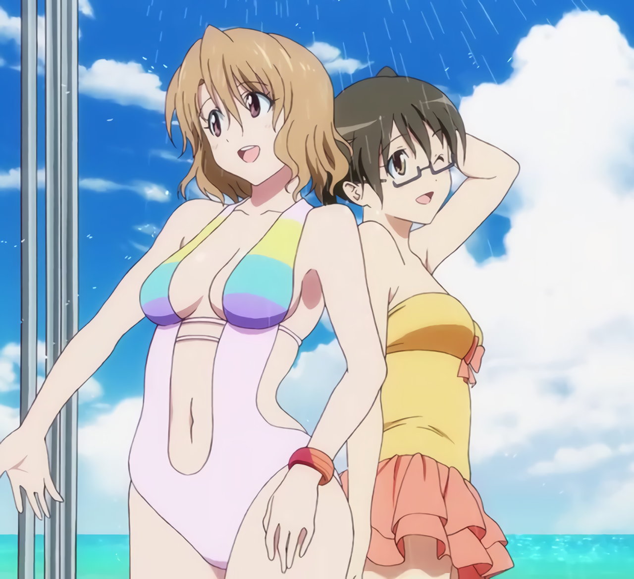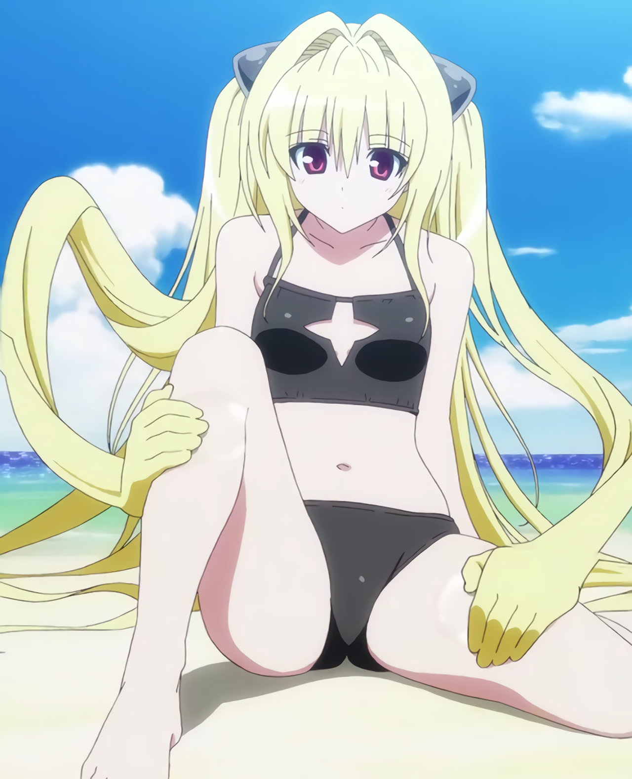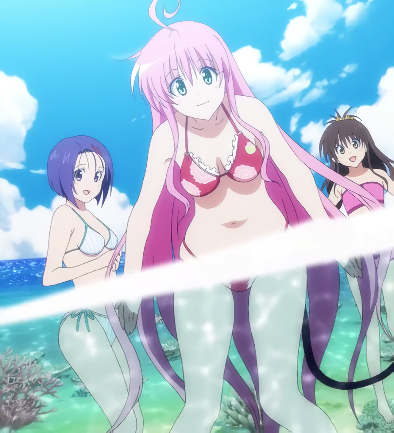水着姿の沙姫、凛、綾、ララ、美柑。