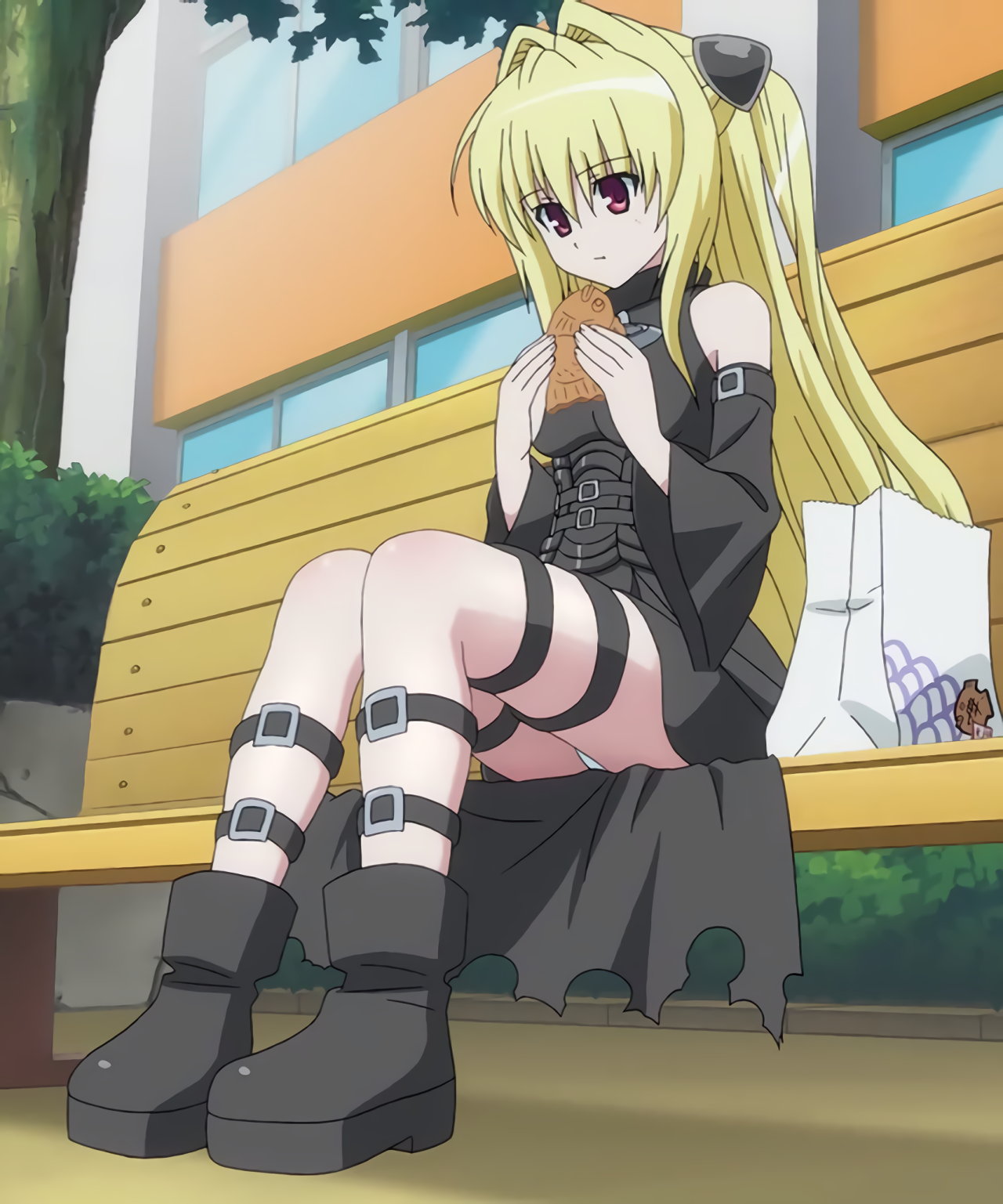 ベンチに座り、パンチラしながら鯛焼きを食べるヤミ。