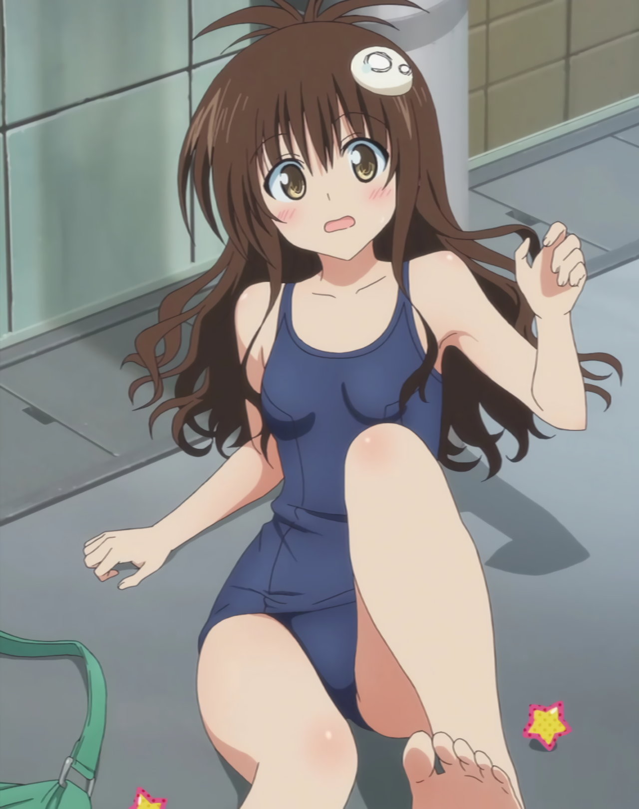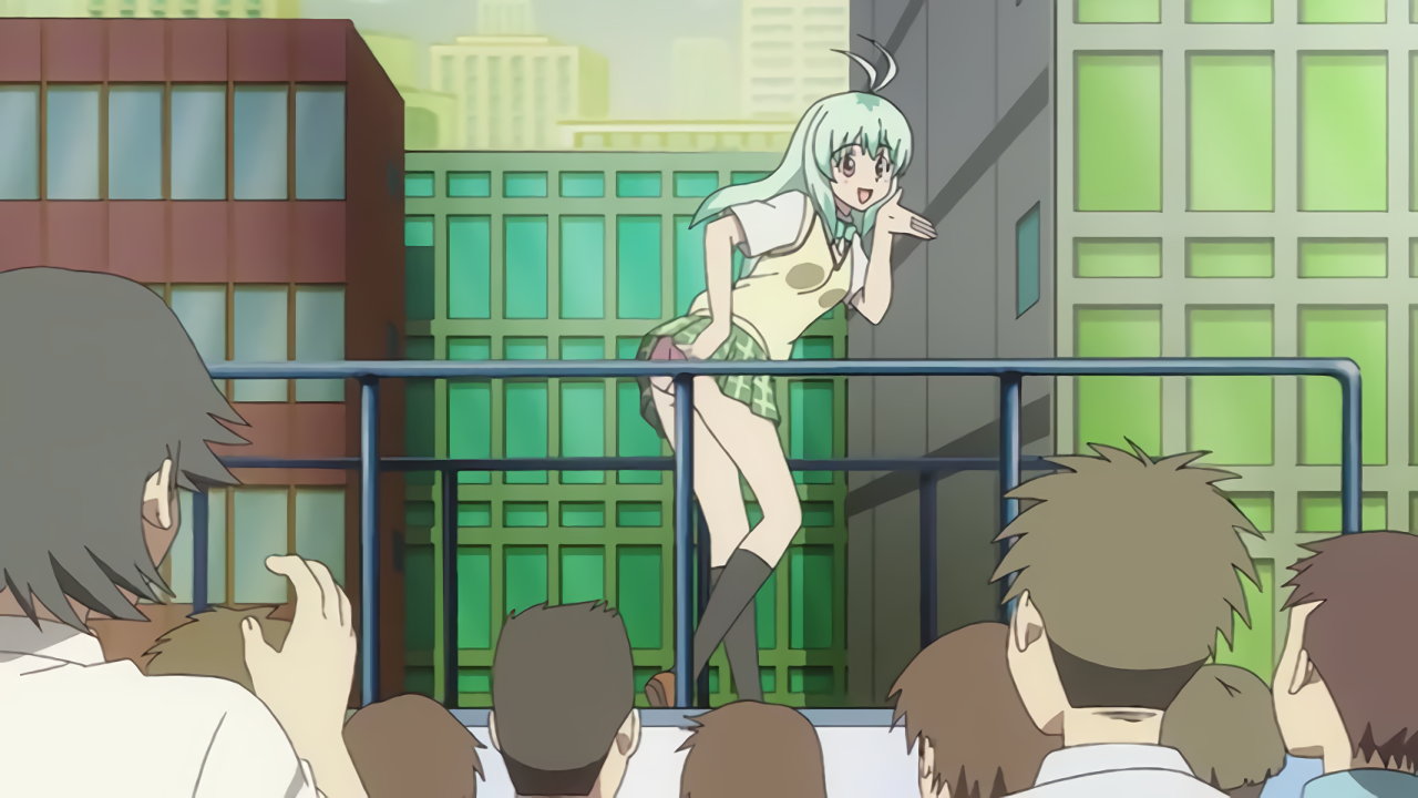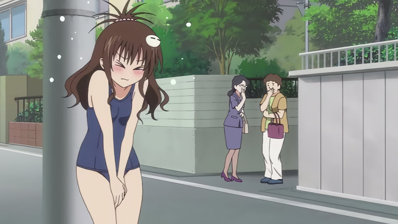 電柱に激突してペケが誤作動し、住宅街のスクール水着姿に変身させられた美柑。