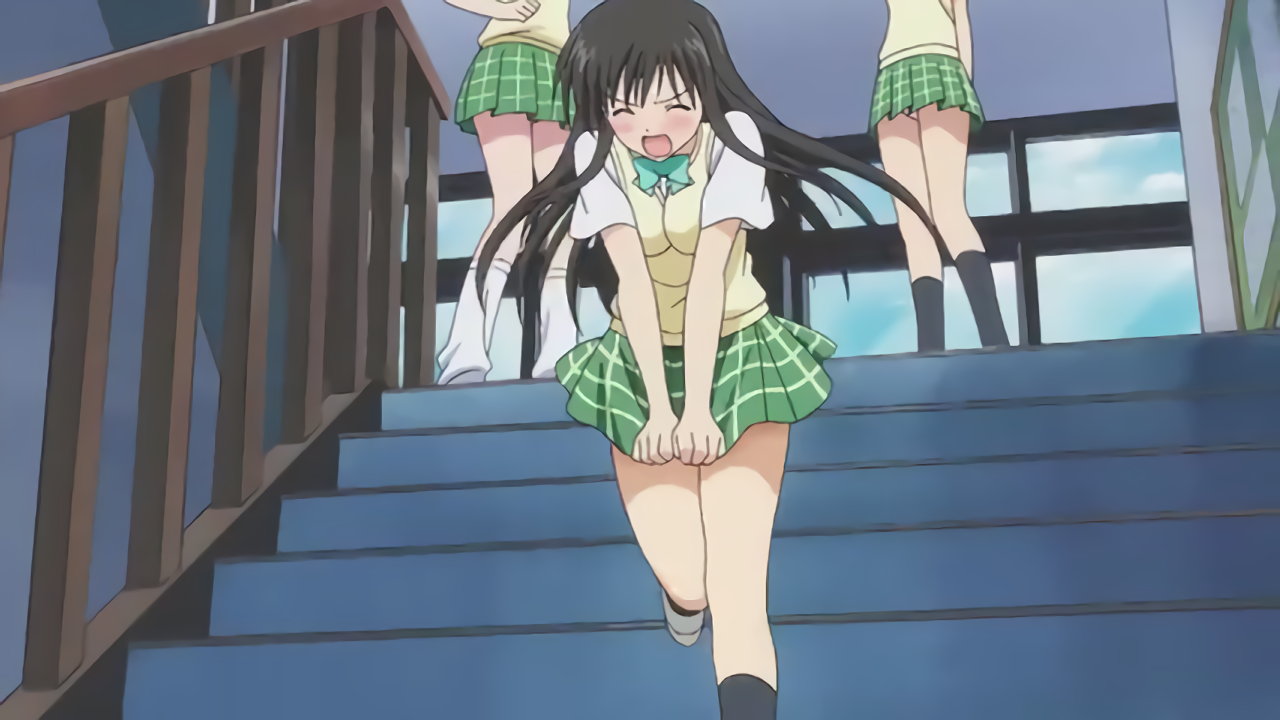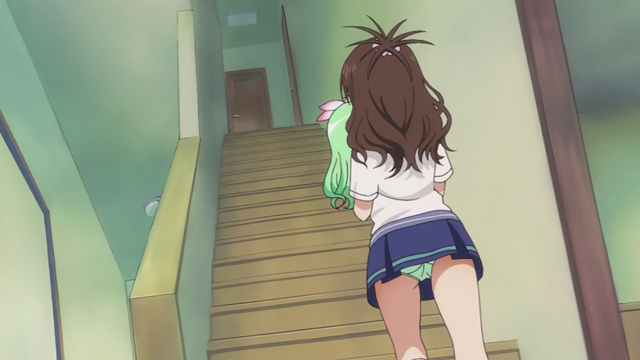 セリーヌを抱き、パンチラしながら階段を上る美柑。