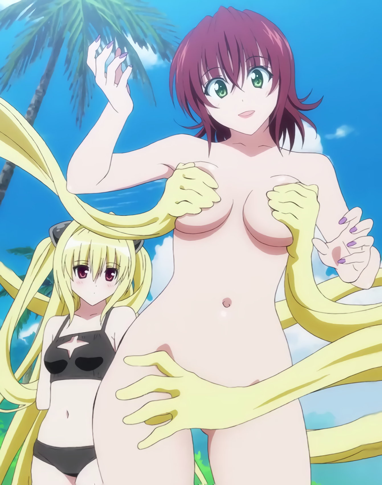 全裸涼子の局部を髪で隠すヤミ。