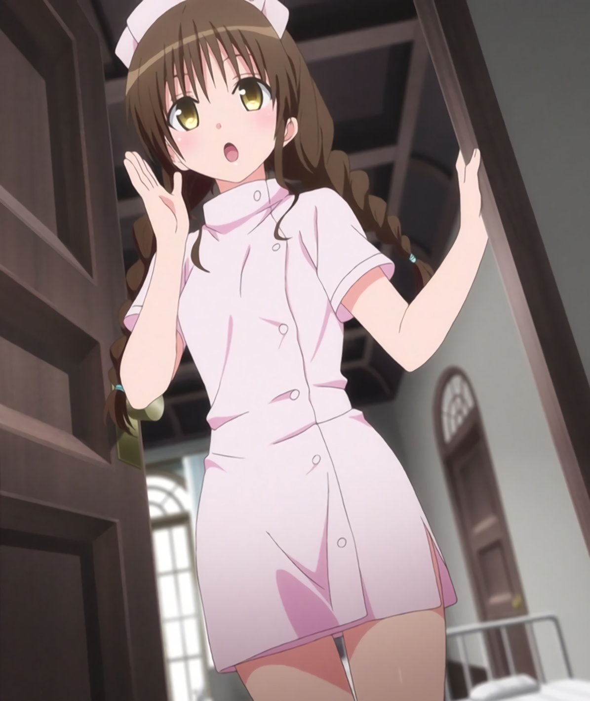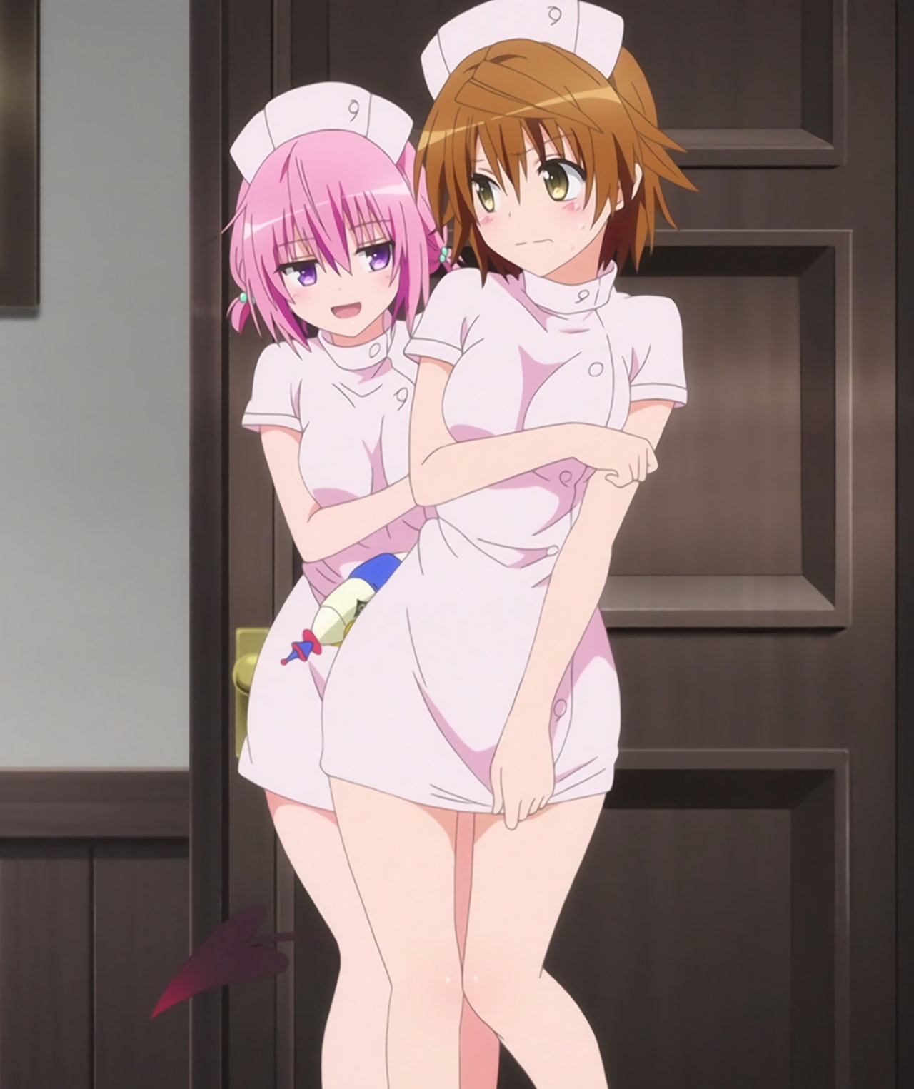 ミニスカナース服を着た、美柑とモモ。