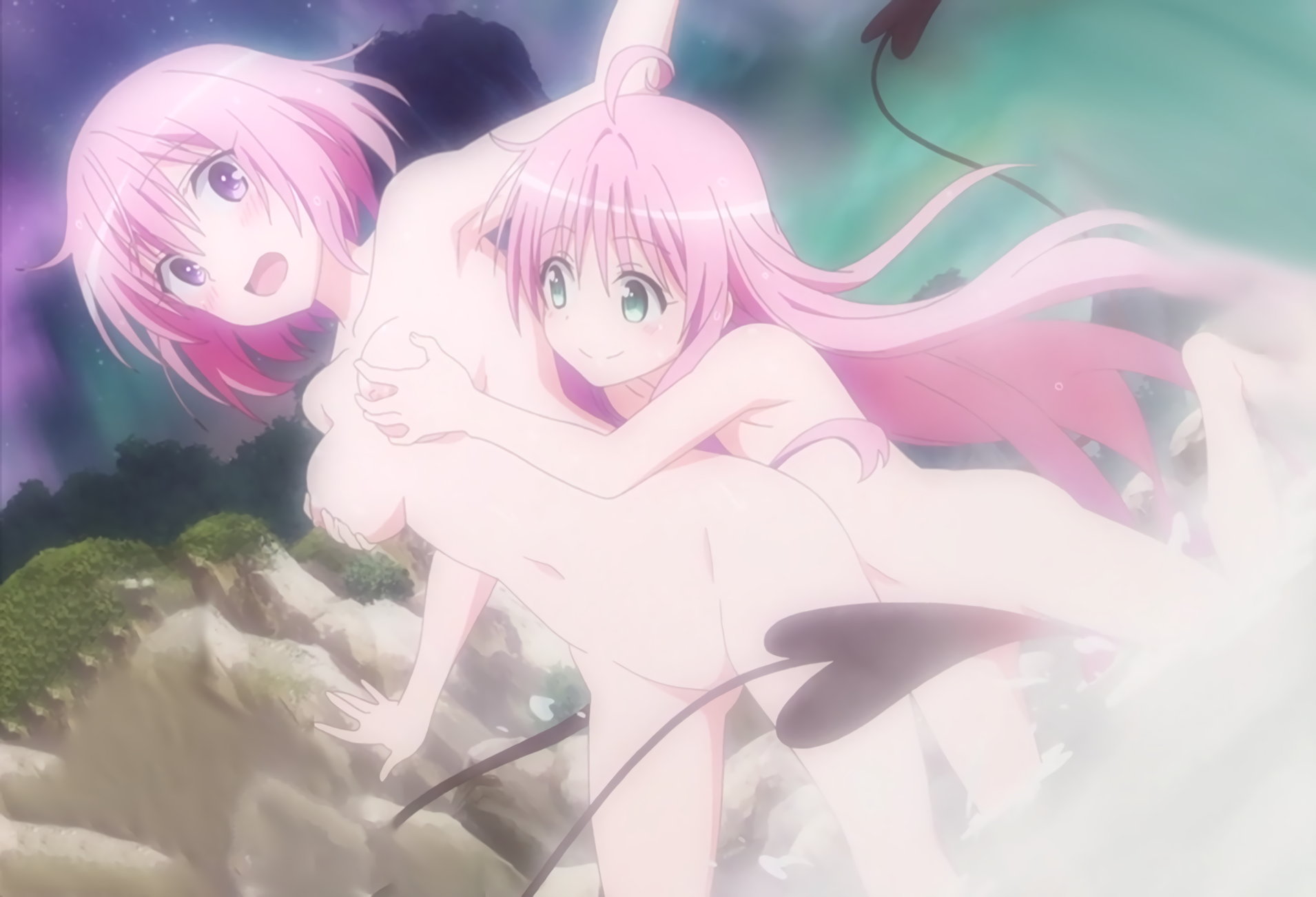 リト集団に襲われて服を剥ぎ取られ、おっぱい丸出しで悶える、ヤミと芽亜。