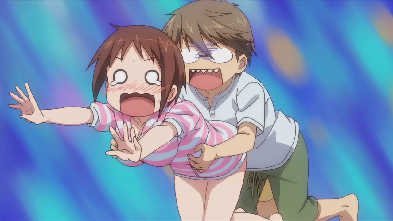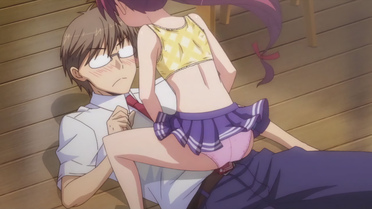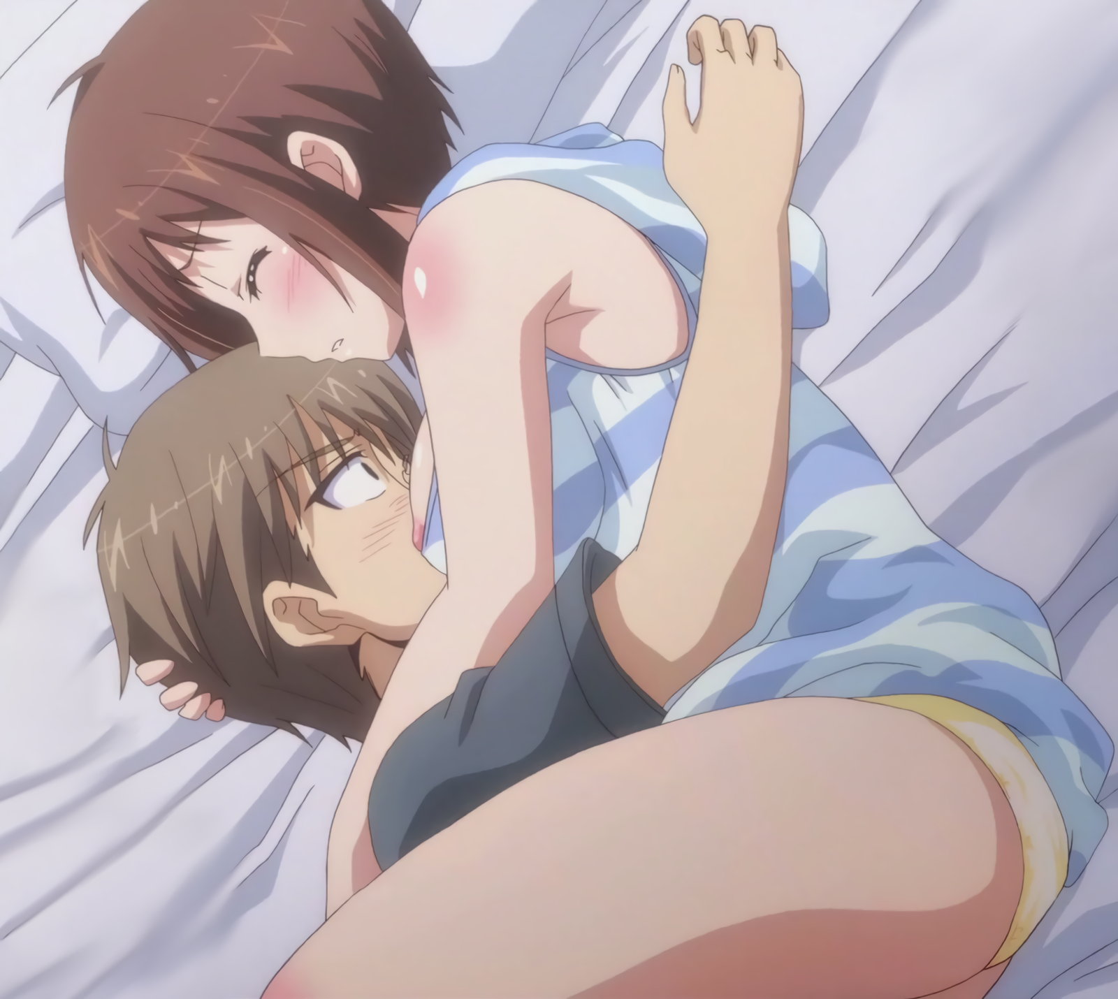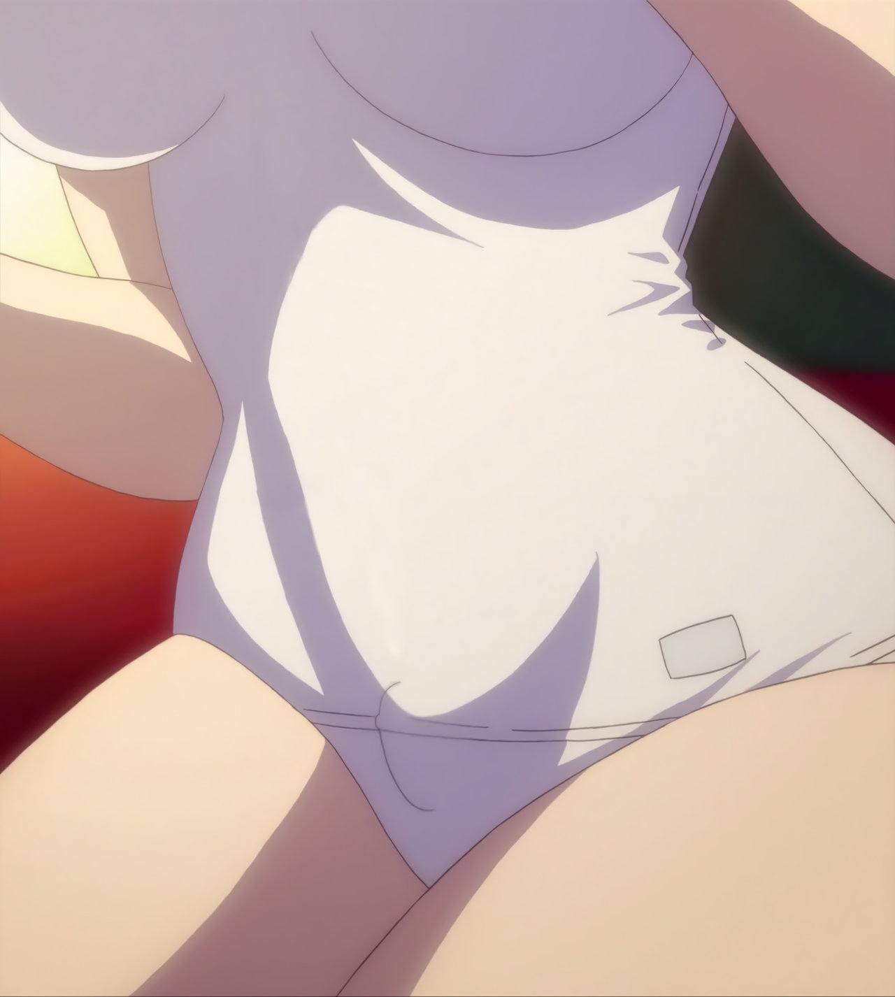 隼斗を押し倒す、白スクール水着姿の倫。