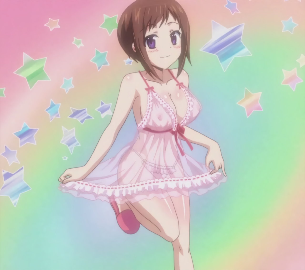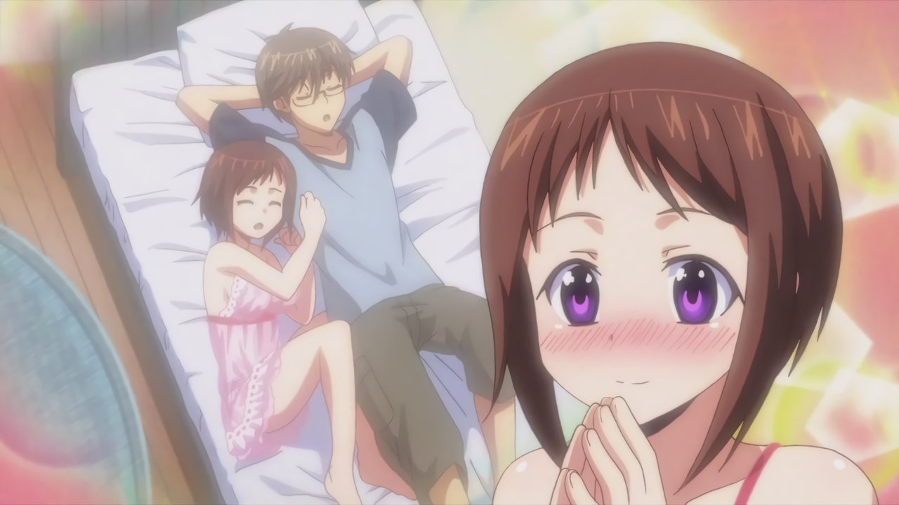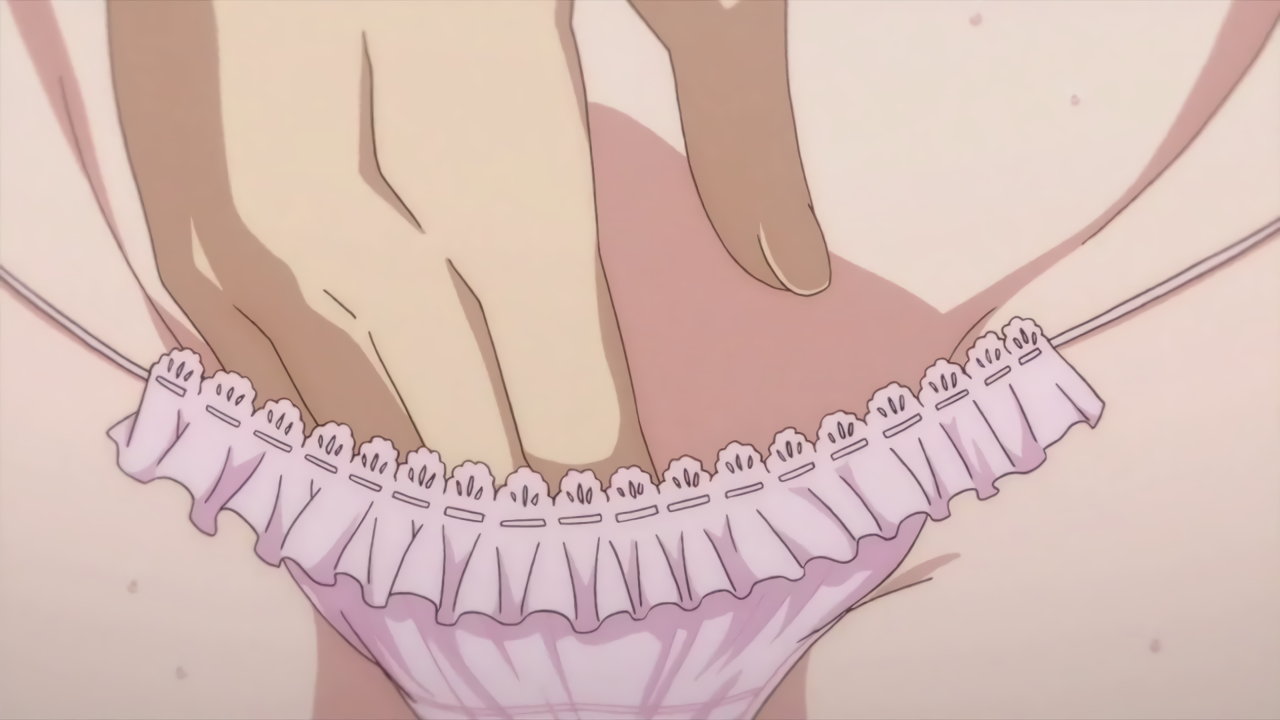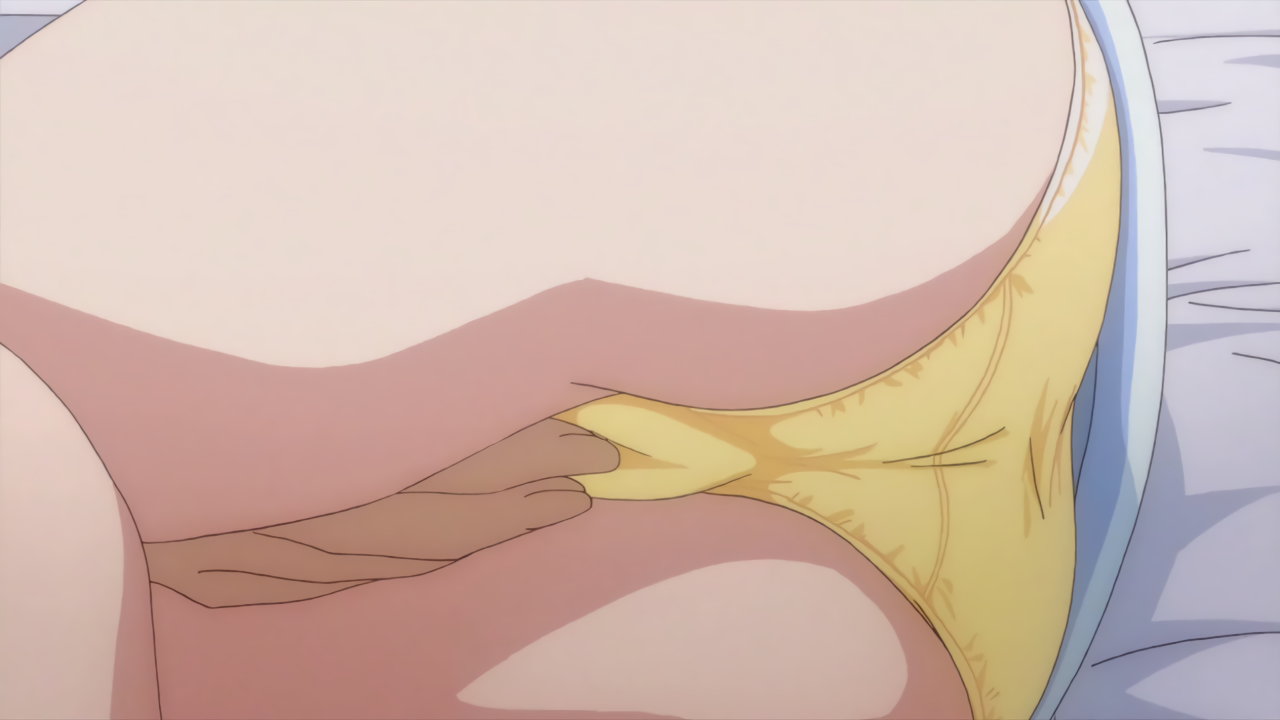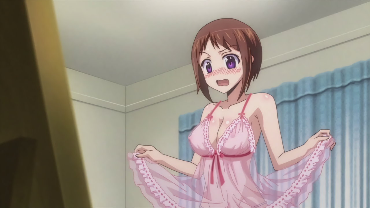 寝間着姿の羽衣。上衣が開けて胸の谷間が見え、下半身はパンツだけのエロい格好をしている。
