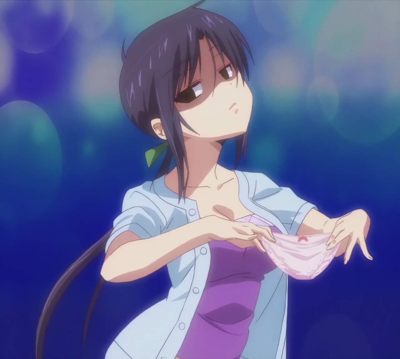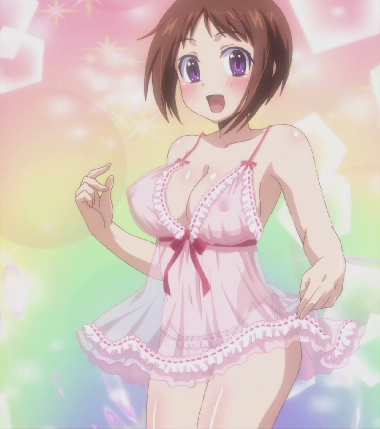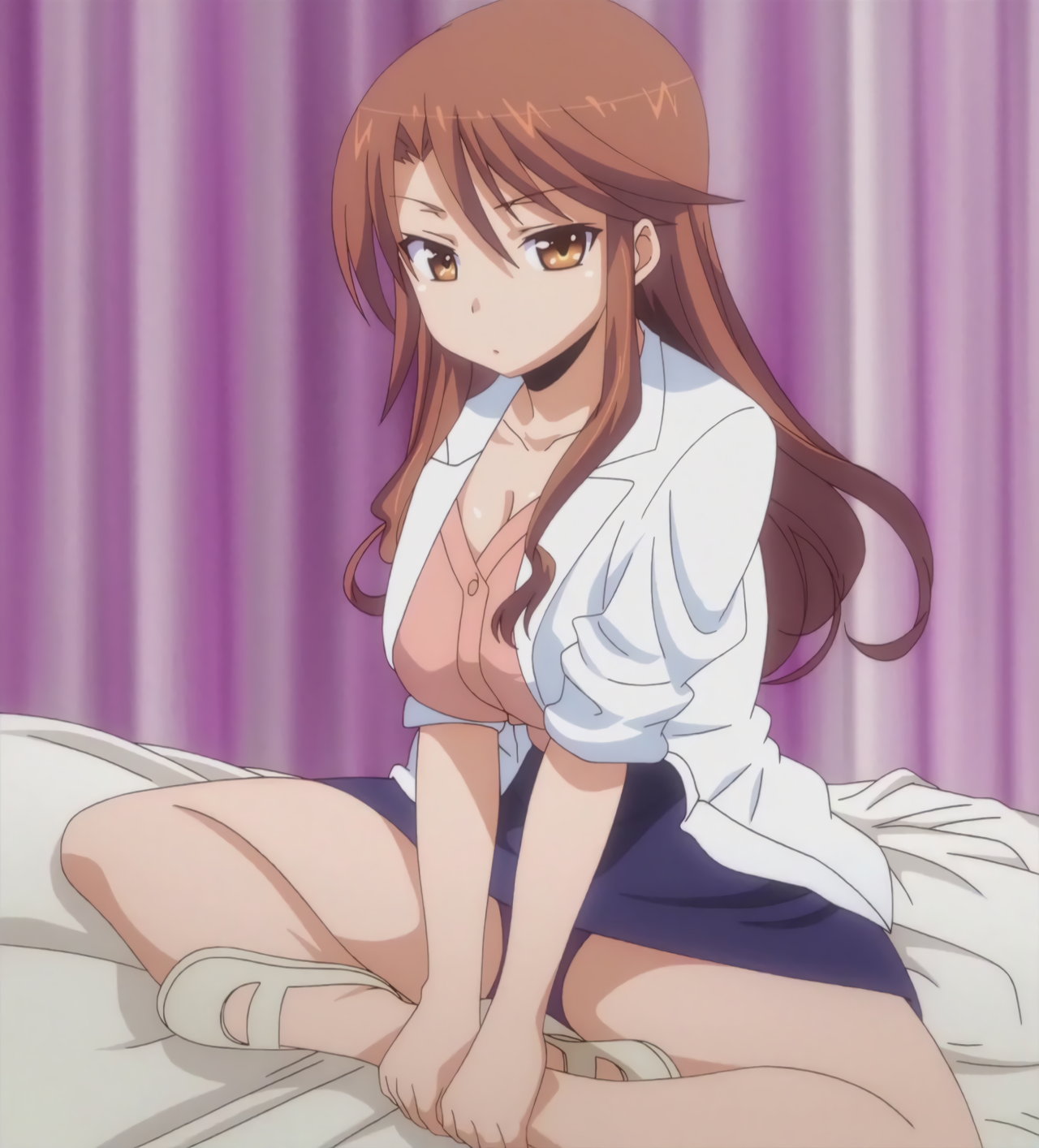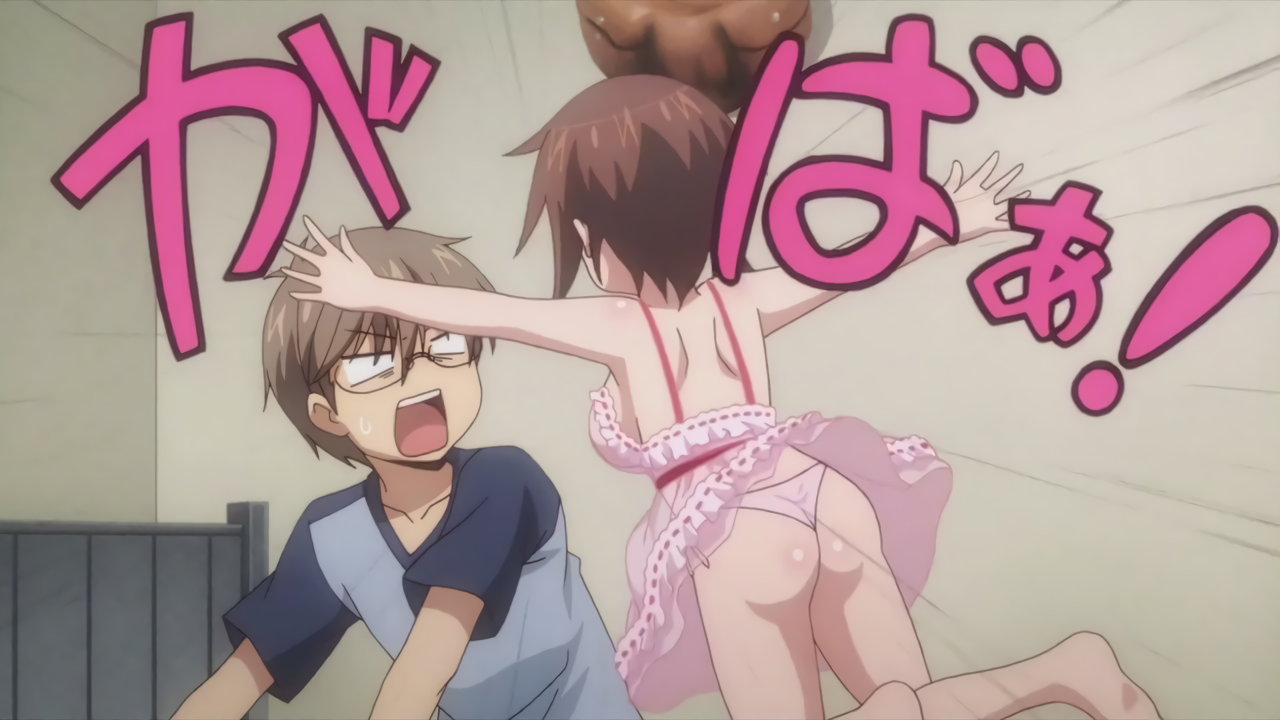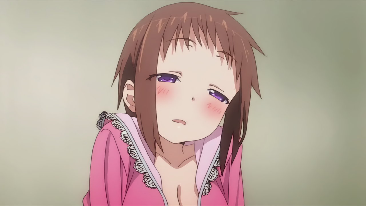 寝間着姿の羽衣。上衣が開けて胸の谷間が見え、下半身はパンツだけのエロい格好をしている。