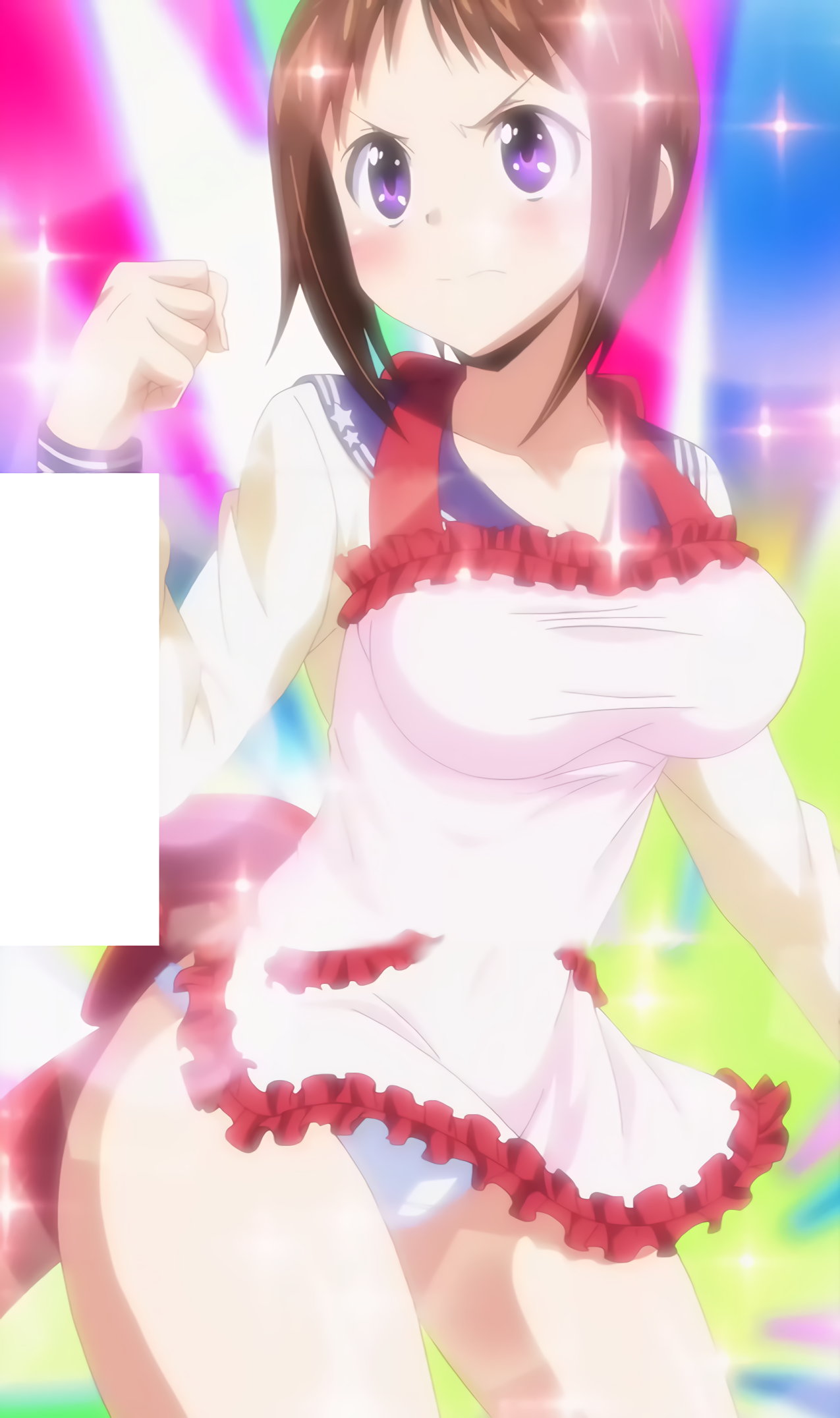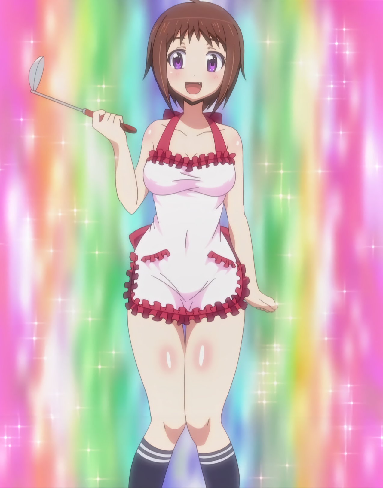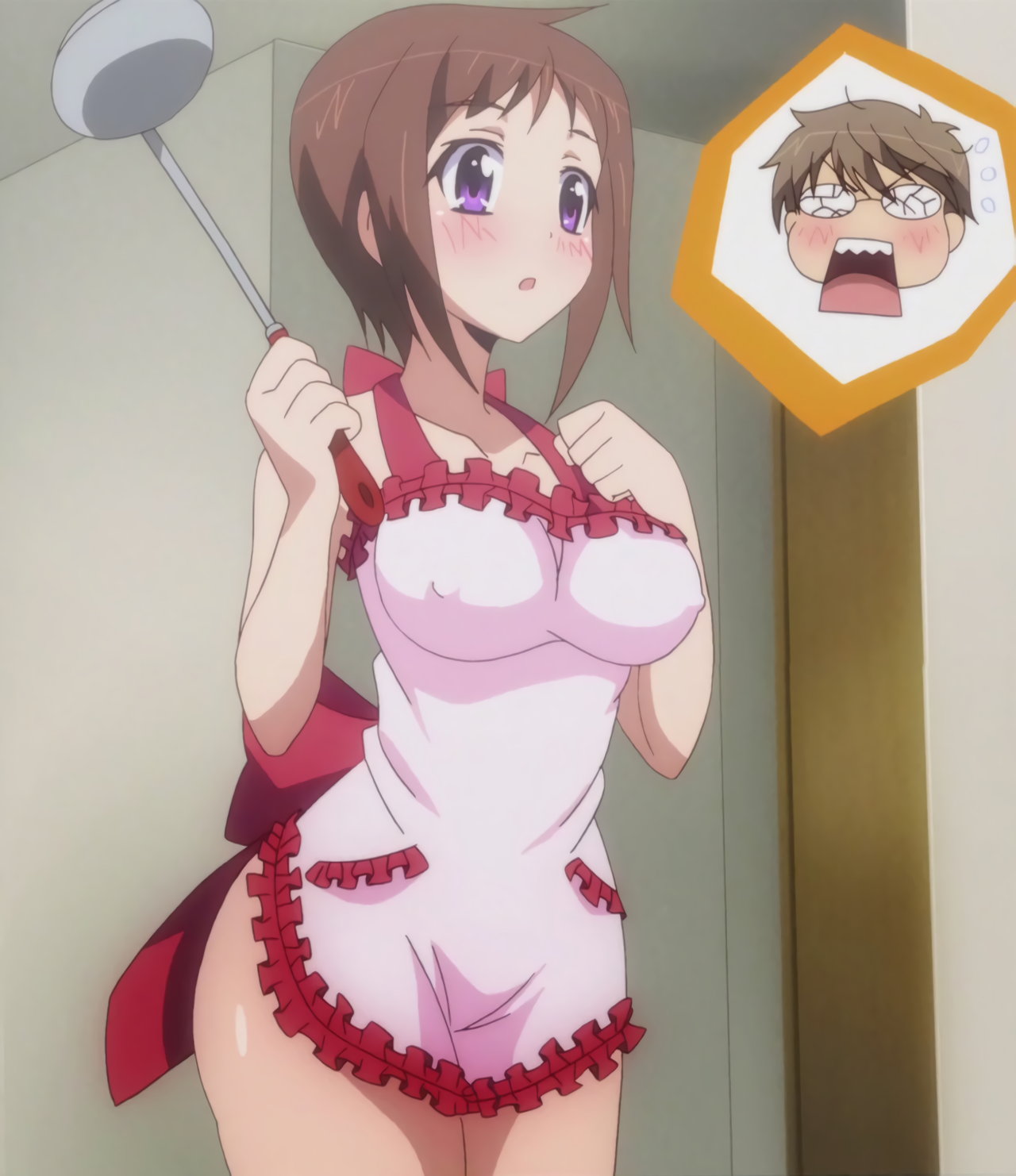 エプロンがずり下がり、乳首ポロリする羽衣。