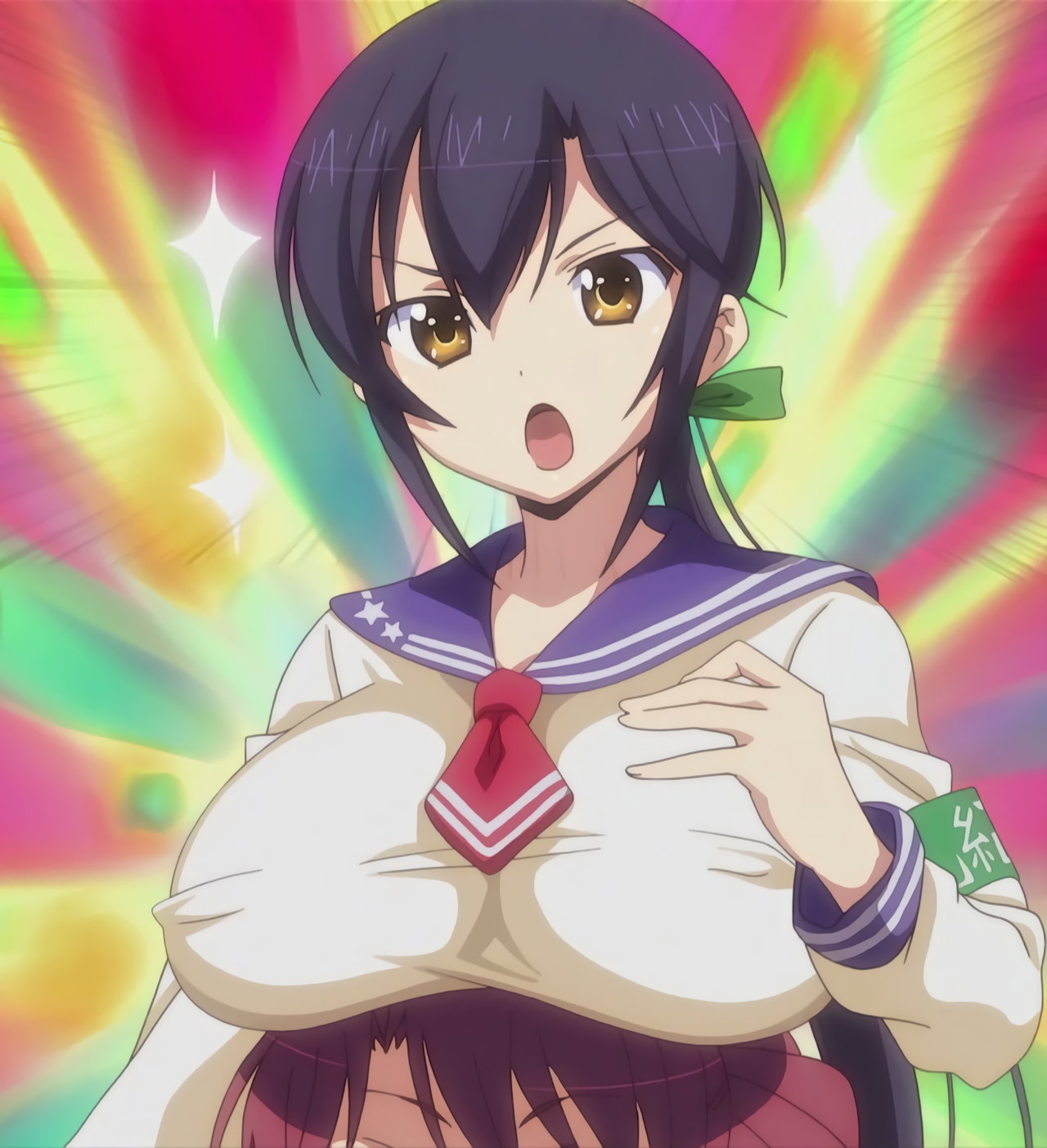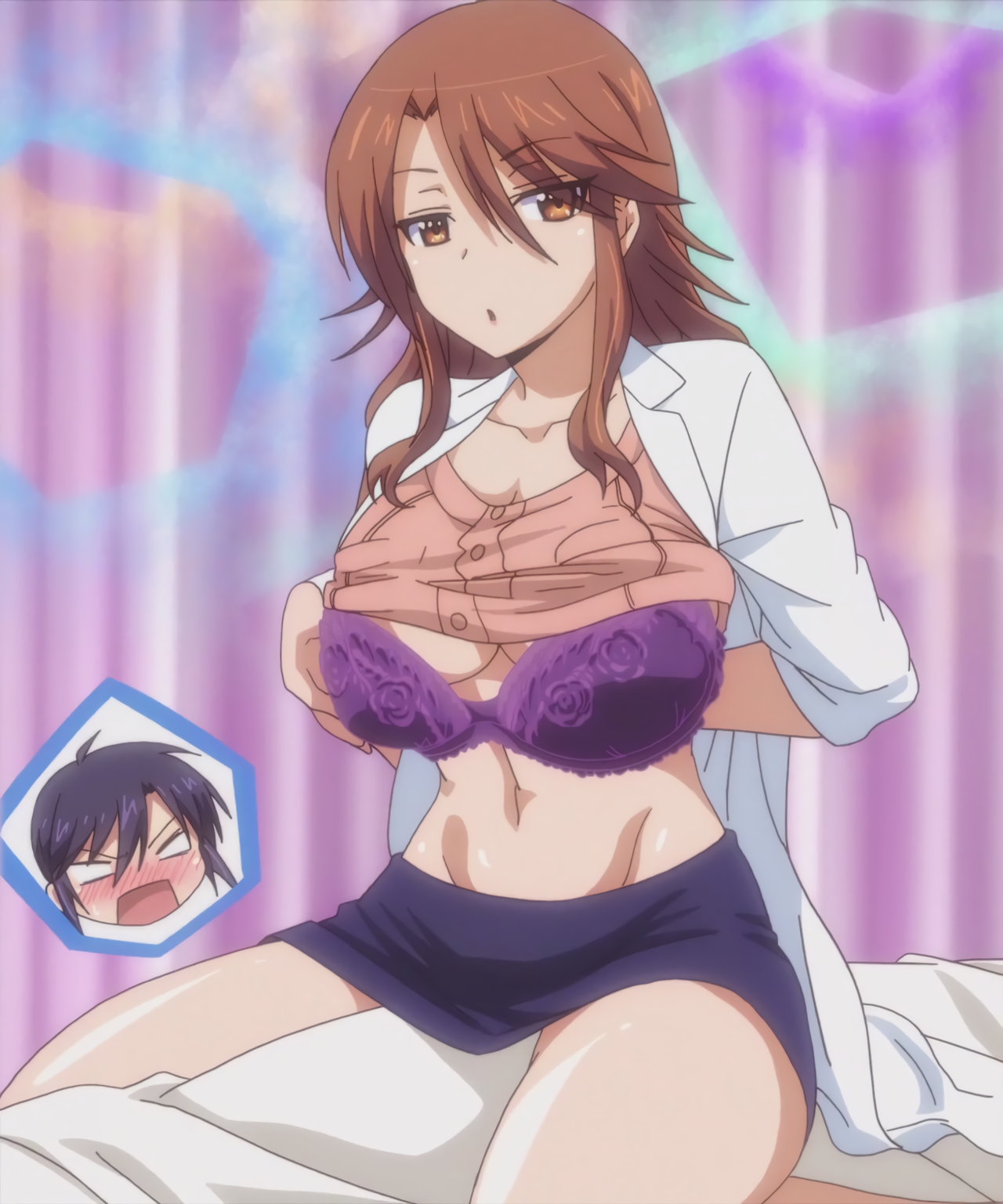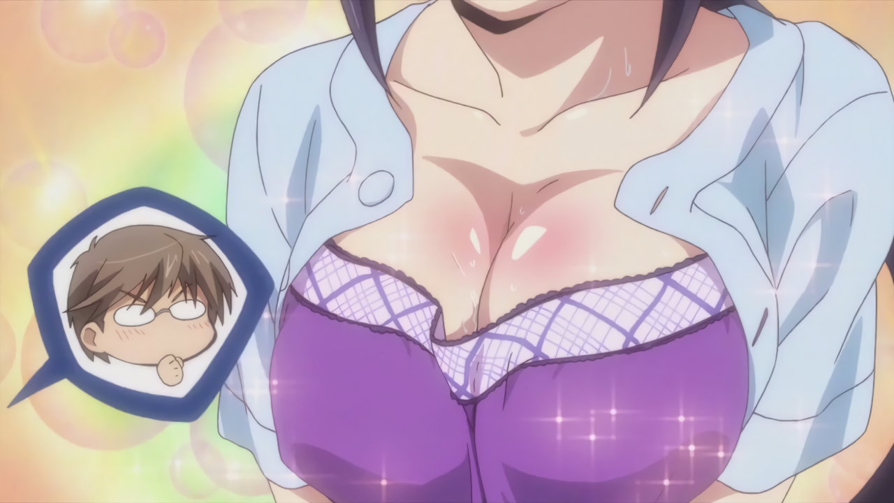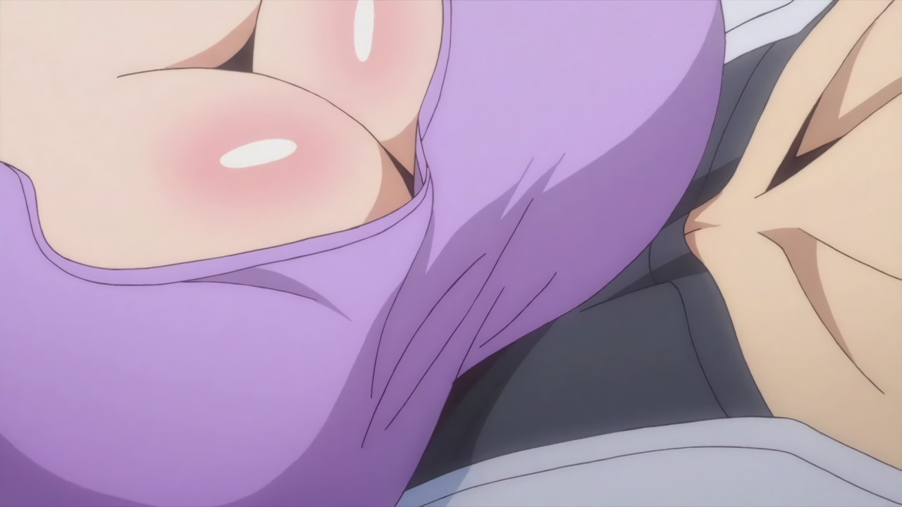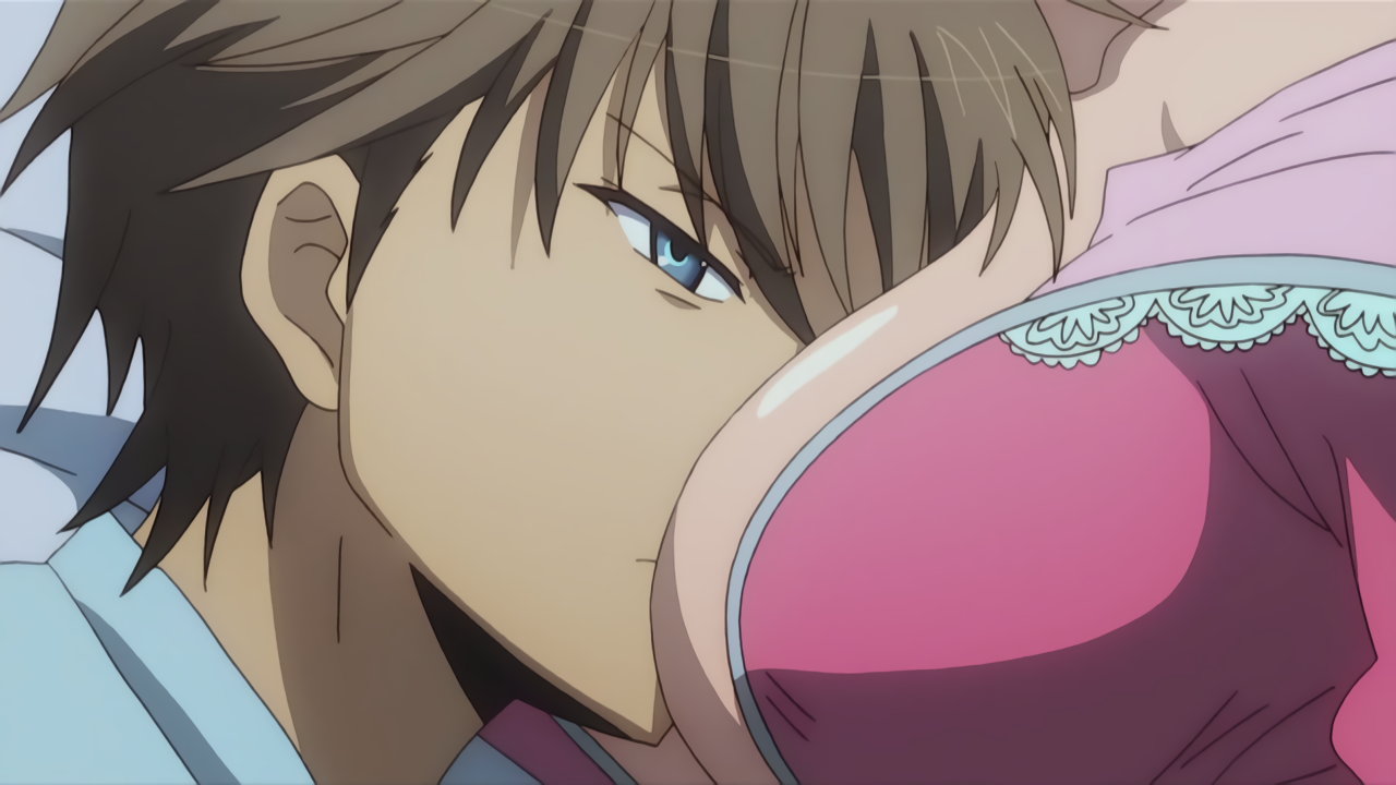 隼斗の顔面を直撃する、羽衣の乳房。その衝撃により、煩悩が開放された隼斗は、羽衣の乳を吸い始める。