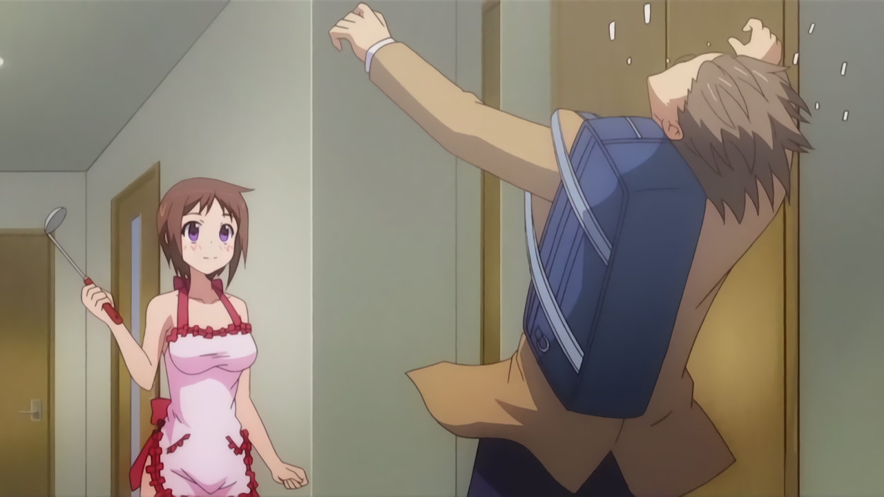 帰宅した隼斗を出迎える、裸靴下エプロン姿の羽衣。