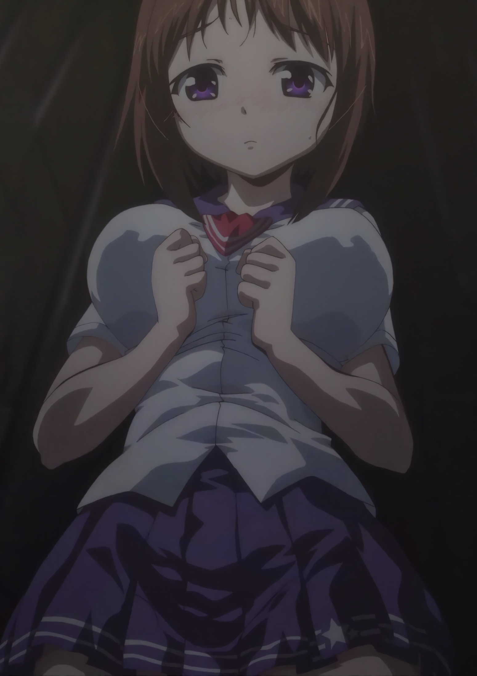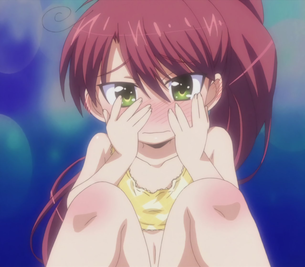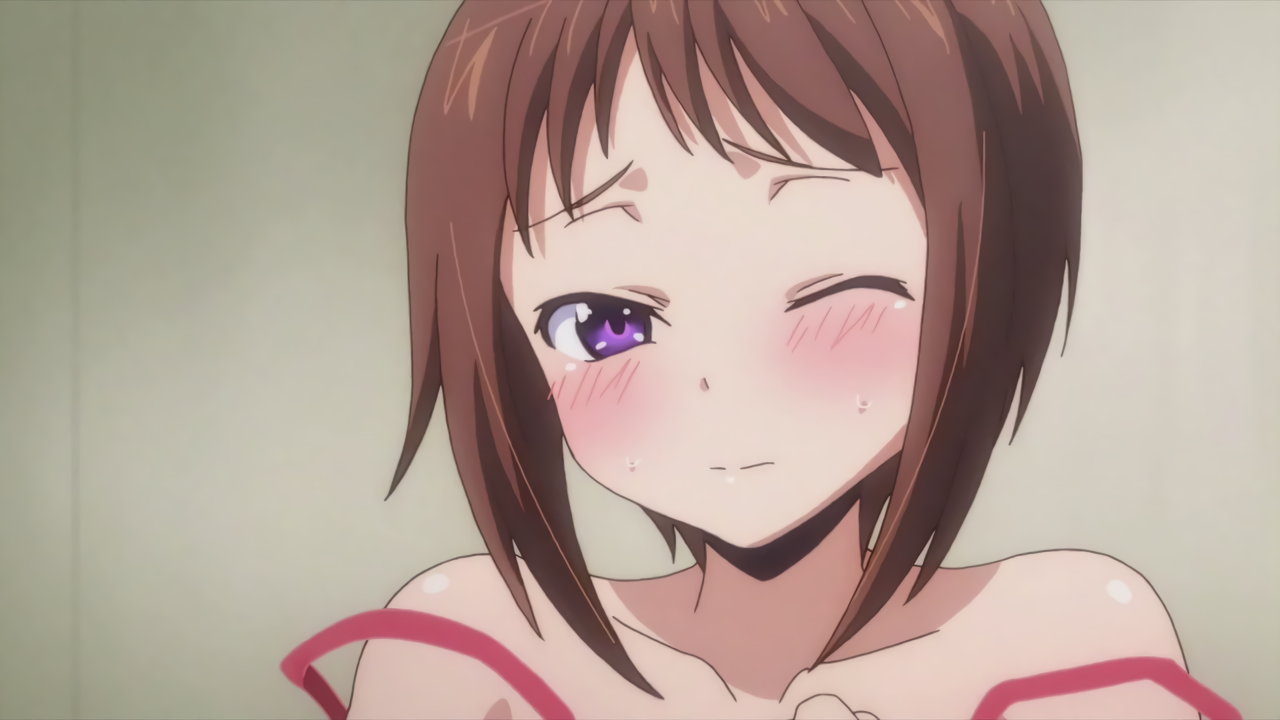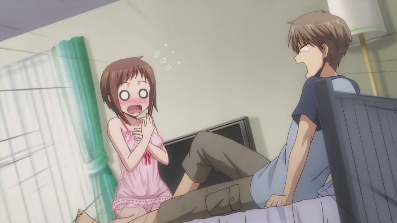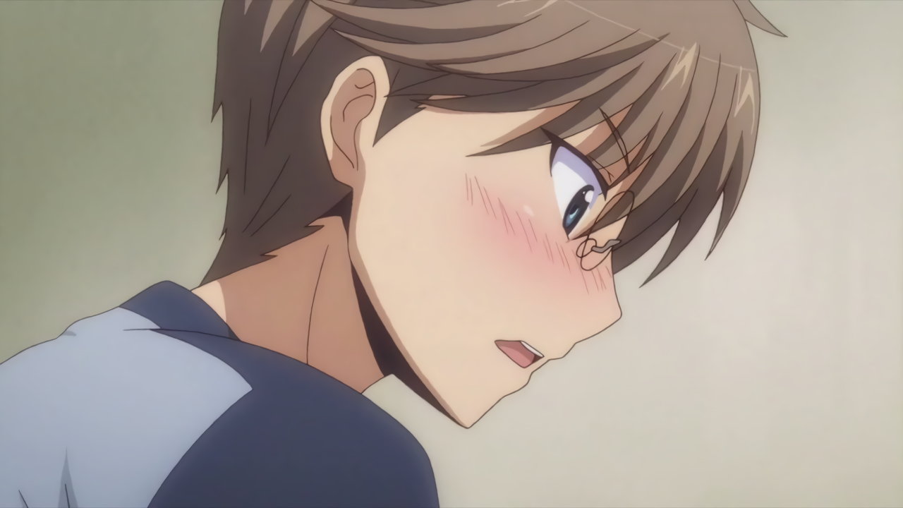 羽衣のパンチラ・透け乳首を見ないよう、強く目を瞑る隼斗。