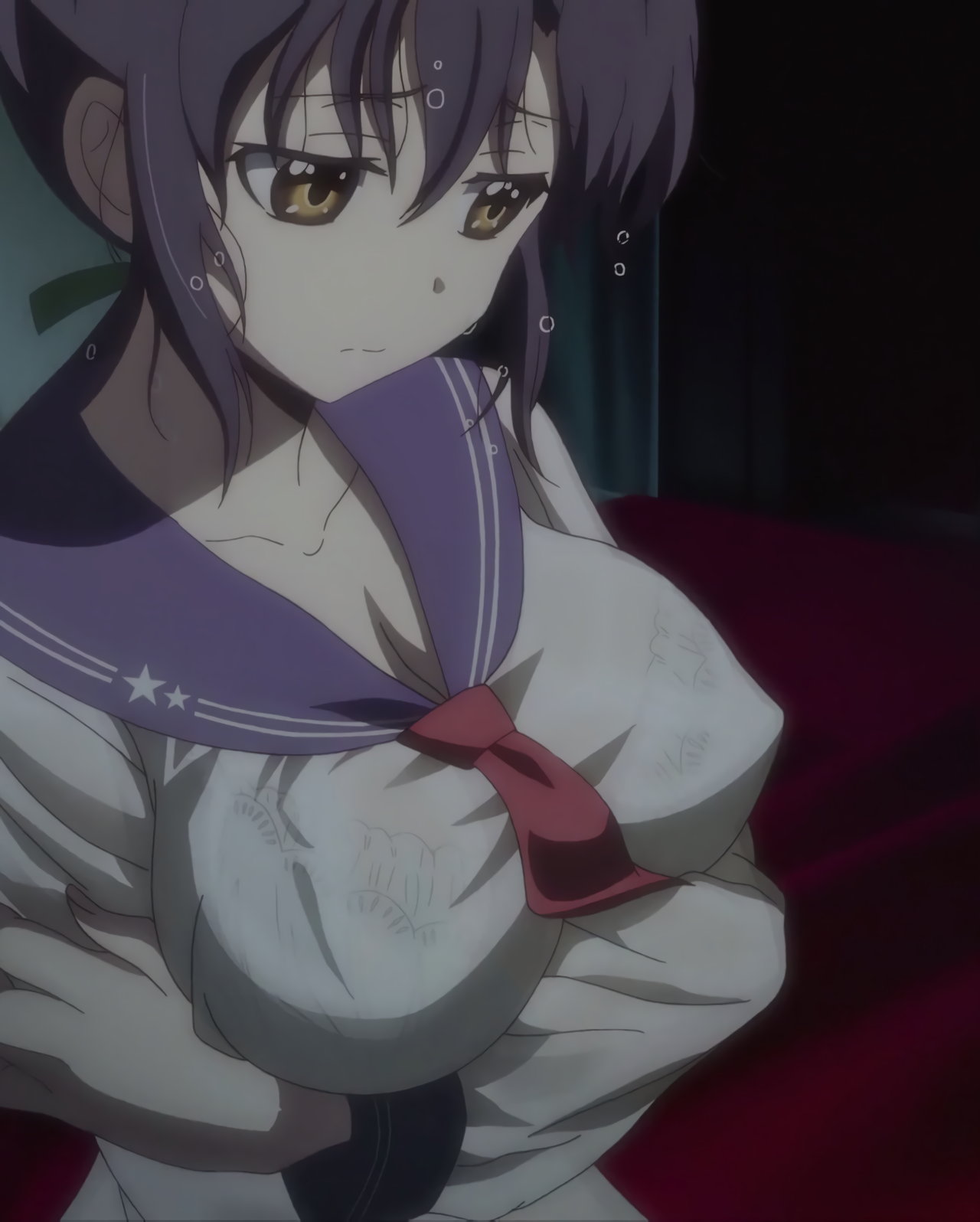制服が濡れ、透けブラする倫。