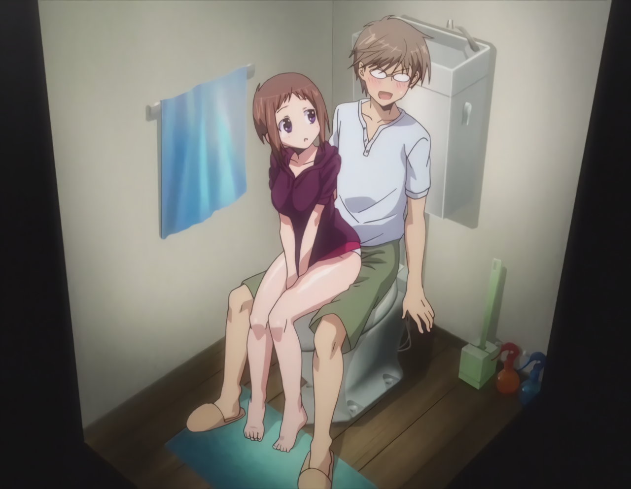 倫の目から逃れるため、トイレの中に隠れた二人。隼斗の上に背面座位で座る、下半身パンツだけの姿の羽衣。