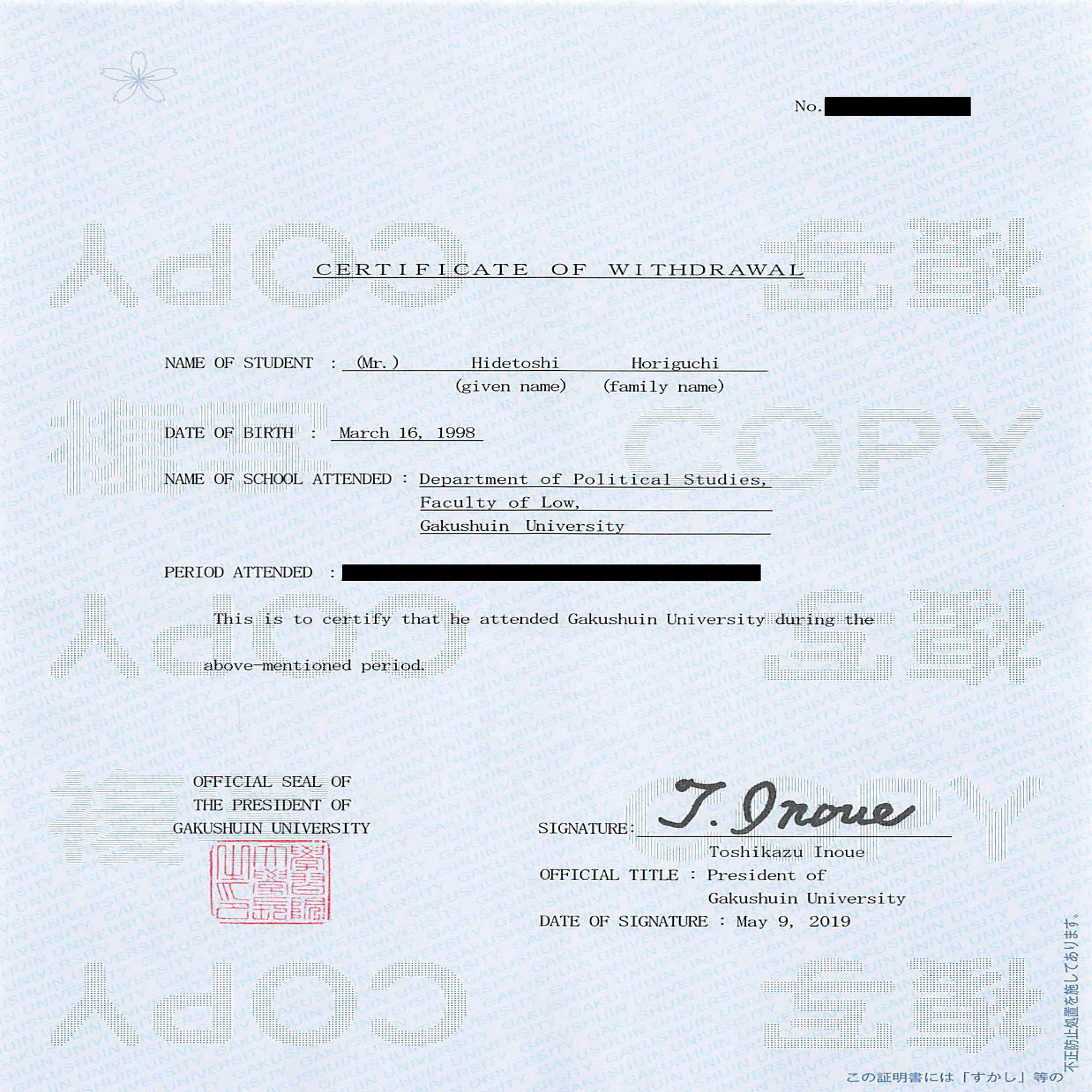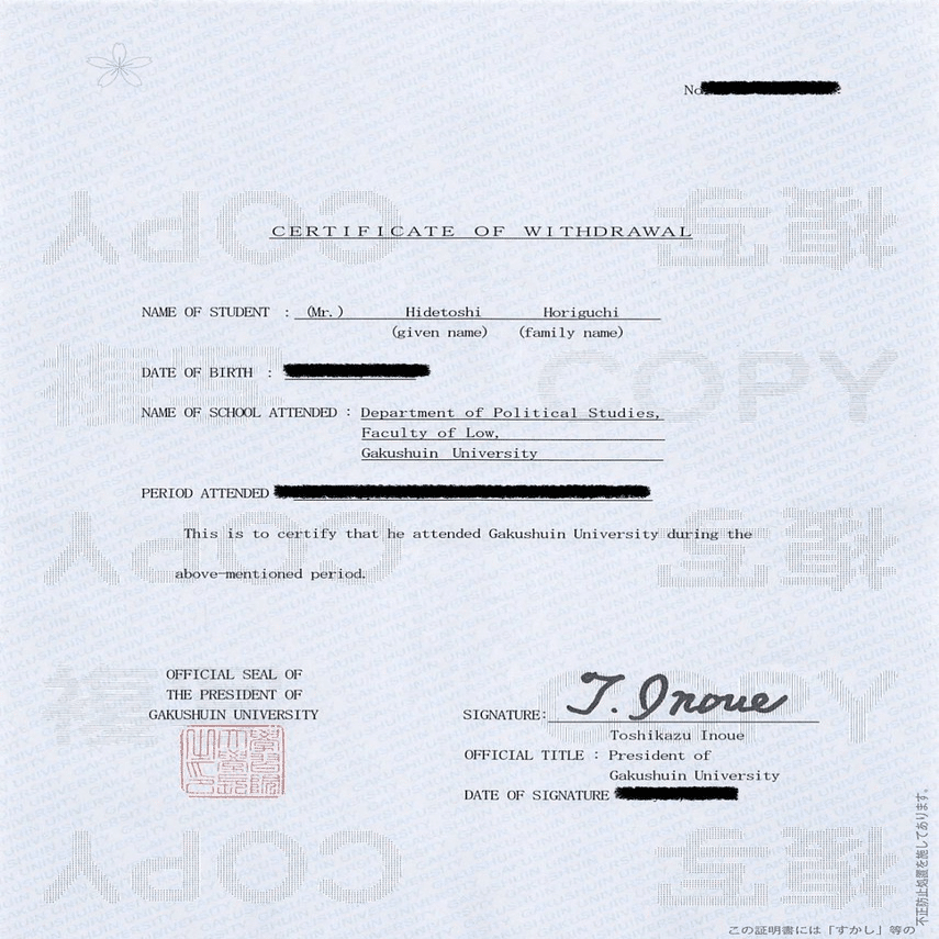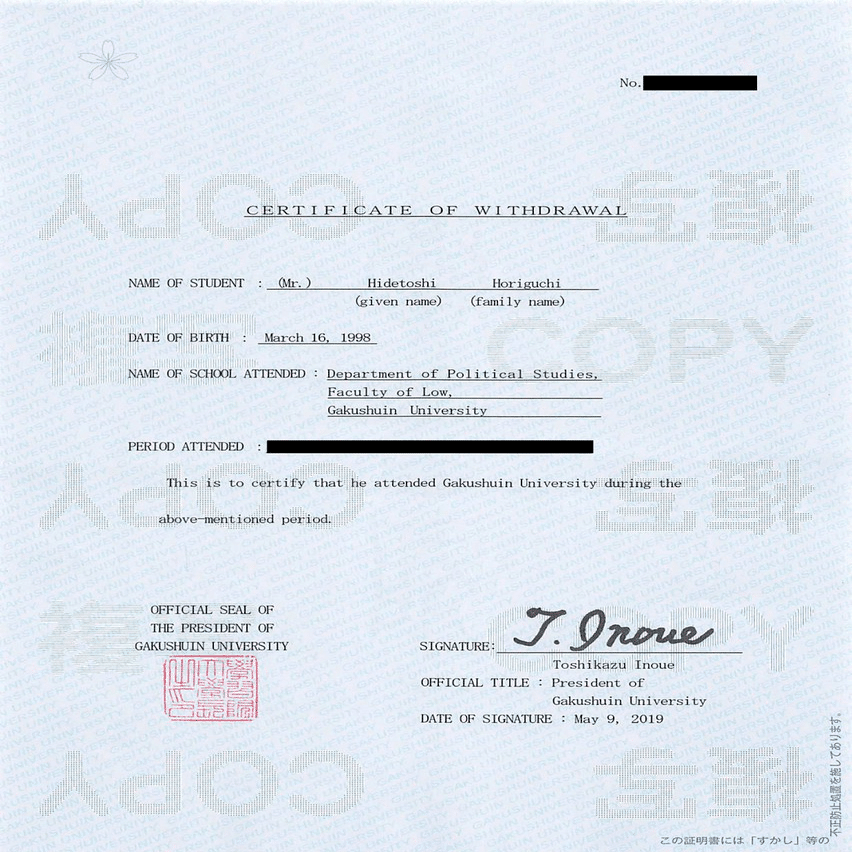 証明書の PERIOD ATTENDED 在籍期間 の欄が墨消しされていて、確認はできない。学則によれば、退学日は学期末日となる。堀口くんの言を信じるならば、この欄は 2016年4月1日~2019年3月31日 となっているはずである。