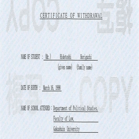 堀口英利は学習院大学の退学証明書(英文)を取得したら、本来 Faculty of Law となるところが Faculty of Low になっていたと投稿している。