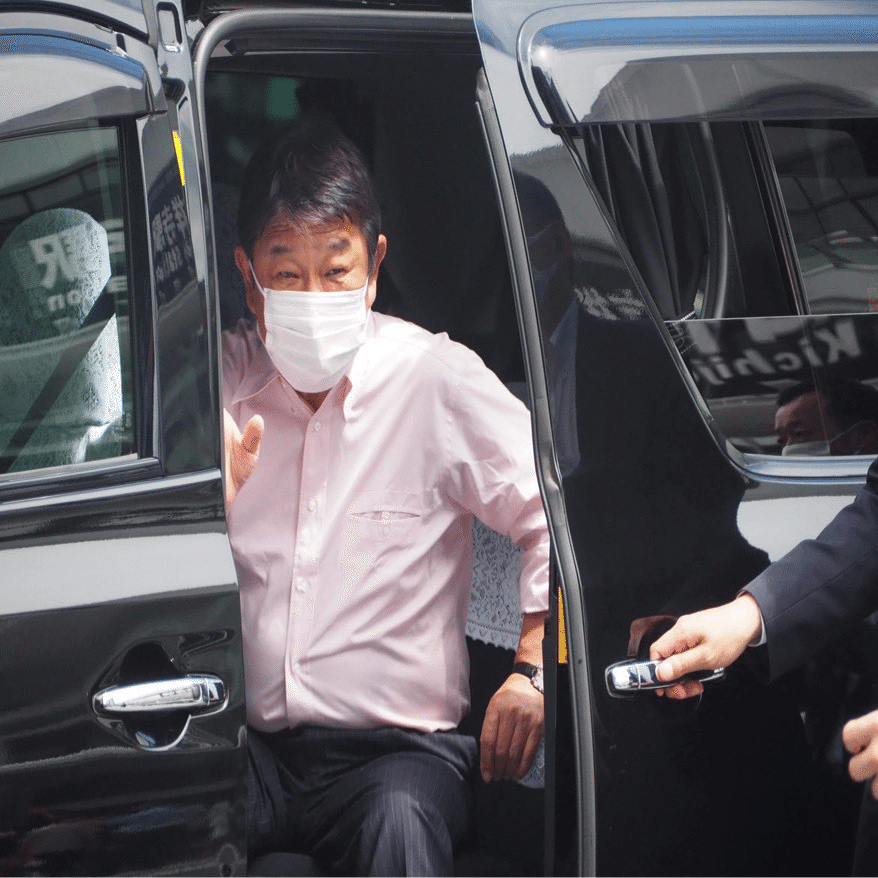 アルファードから降りる茂木幹事長。