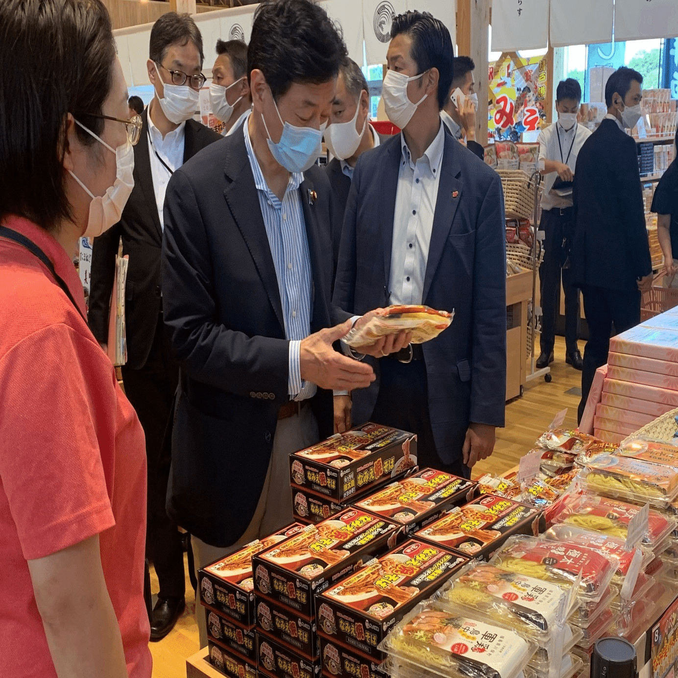 道の駅なみえを初めて訪問。地元の人たちが訪れていました。 B級グルメで有名な「なみえ焼そば」をお土産に購入しました。 西村康稔さんと同じ構図の写真を撮って店員さんに見せたら大ウケしました。