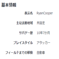 自己紹介の記載はなく、積極的にメンバーと交流しない RyanCooper の性格が伺える。基本情報として、プレイスタイルとフィールドまでの移動手段が記載してある。