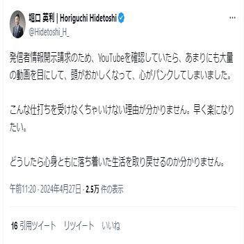 発信者情報開示請求のため、YouTubeを確認していたら、あまりにも大量の動画を目にして、頭がおかしくなって、心がパンクしてしまいました。
