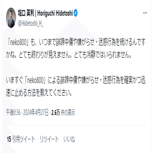 「neko800」も、いつまで誹謗中傷や嫌がらせ・迷惑行為を続けるんですかね。とても終わりが見えません。とても冷静ではいられません。