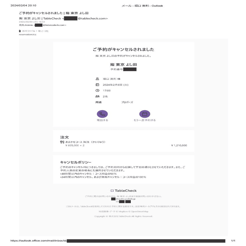 キャンセル確認メールの受信日時は2024年2月4日 18:33 となっており48時間以内のキャンセルとなるため、キャンセル料はコース料金の50%となる。