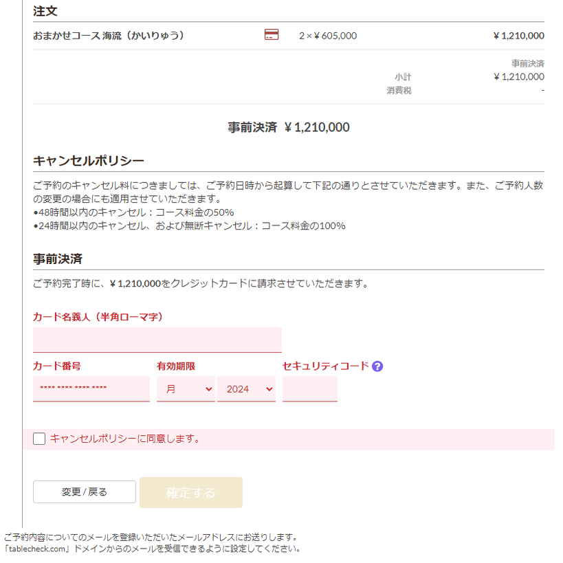 その為、予約申し込み時に決済処理を行い、予約完了時にクレジットカードに請求が行われている。