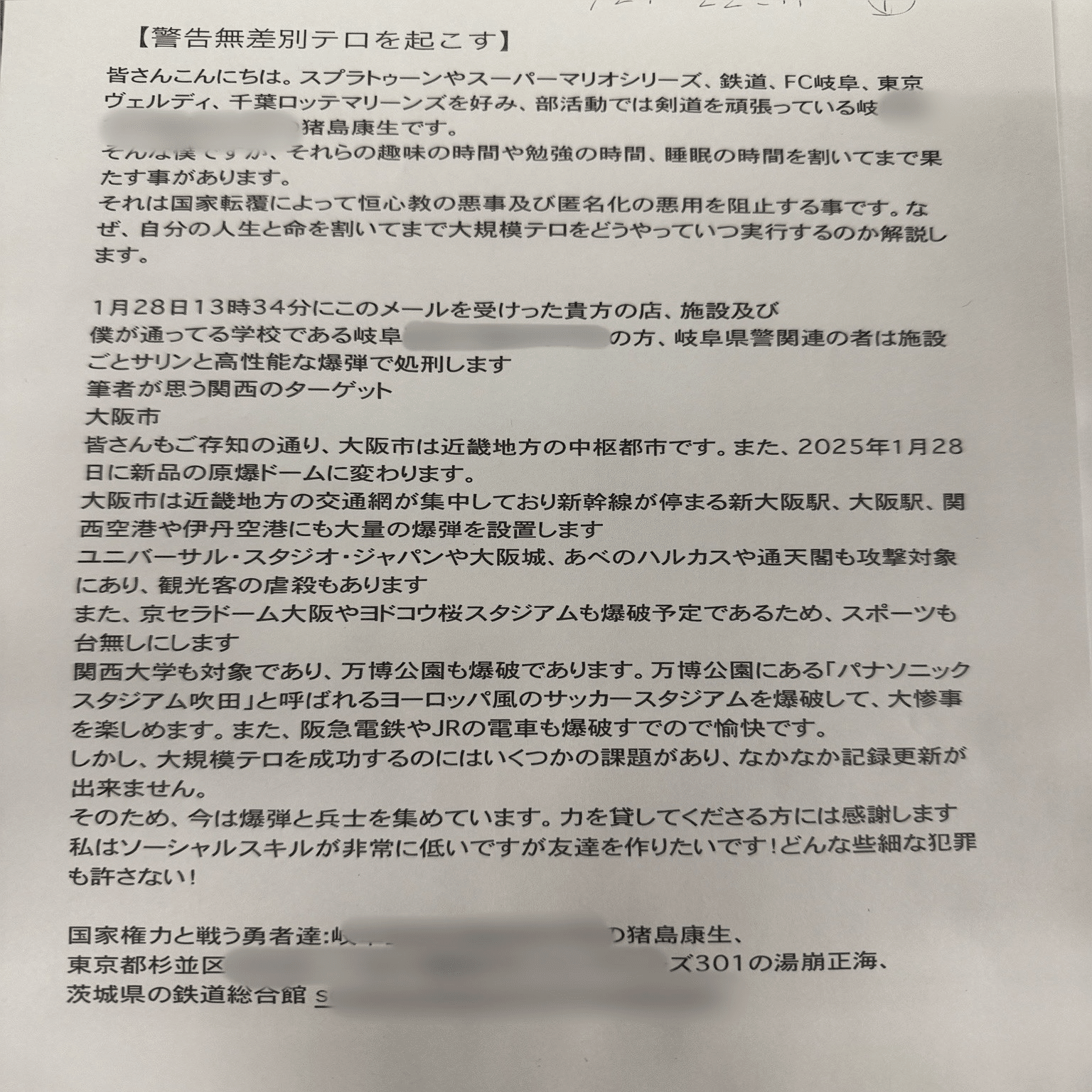 また、埼玉県内の小中学生に危害を加えるという予告メールが埼玉県警察のメールフォームに届いている。過去の事例では、爆破予告において小学生に危害を与える旨を告知している。今回の予告も爆破予告に付随するものと予想される。