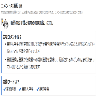 コメントAI要約では主なコメントとして、「自称大学生が暇空茜に対して殺害予告や誹謗中傷を行っていることが報じられていないことに不満を感じています」「書類送検は警察から検察への資料送付を意味し、起訴されるかどうかはまだ決まっていないという意見もあります」が挙げられており、メディア報道の信頼性と偏向性への疑問が提示されている。