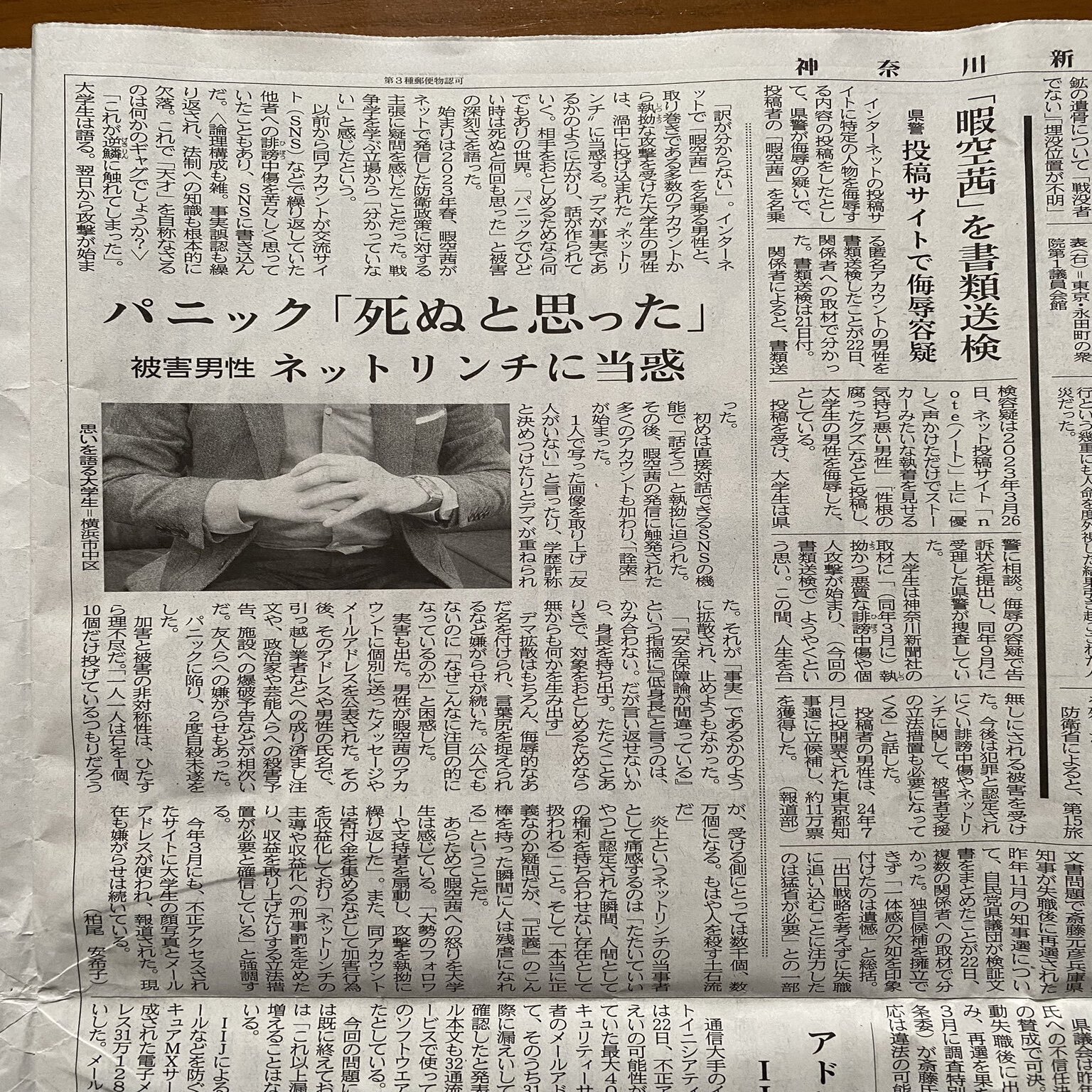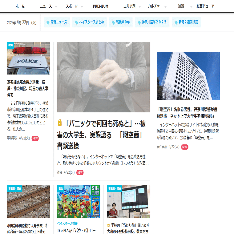 神奈川新聞が2025年4月22日に報じた2件の記事『「暇空茜」名乗る男性、神奈川県警が書類送検 ネット上で大学生を侮辱疑い』、『「パニックで何回も死ぬと」…被害の大学生、実態語る 「暇空茜」書類送検』についての情報をまとめた。