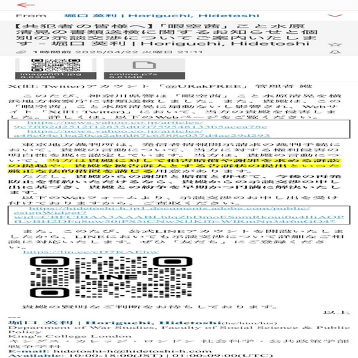 このたび、神奈川県警は「暇空茜」こと水原清晃を横浜地方検察庁に書類送検しました。また、貴殿は、この「暇空茜」こと水原清晃に扇動ないし影響され、Webサイト「X(旧: Twitter)」において、当方の貴殿を侵害しました。詳しくは、以下のWebページをご覧ください。