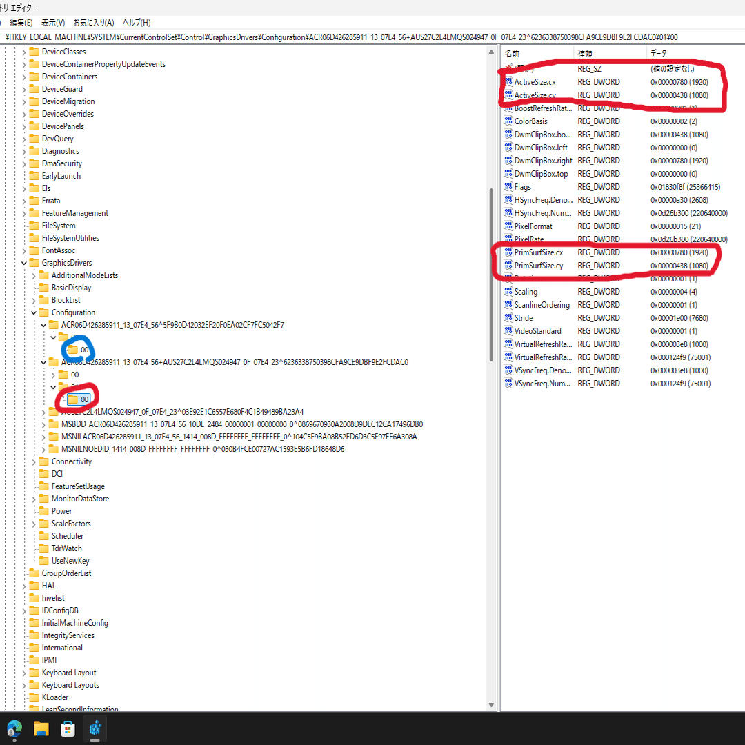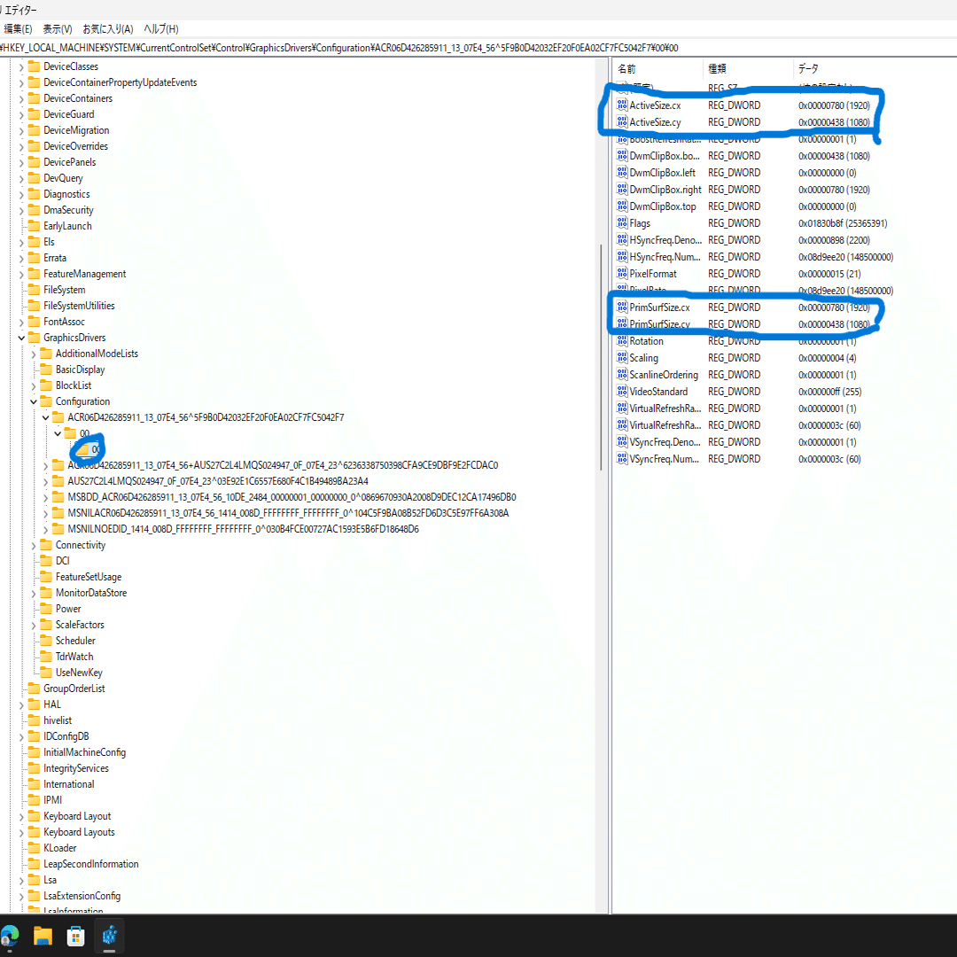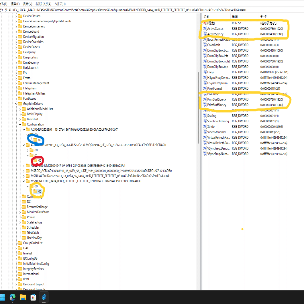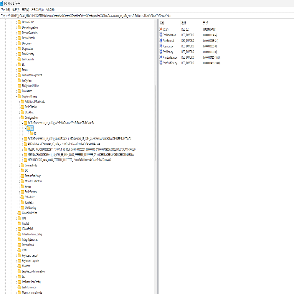 つまり、このキーは「Acerモニターを接続している時に、緊急用ドライバーで表示した際の設定」という記録フォルダになる。