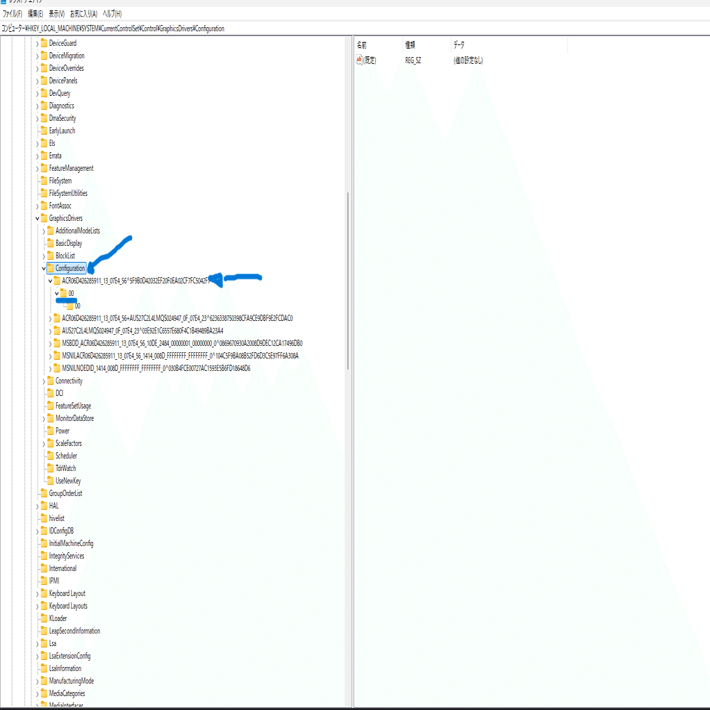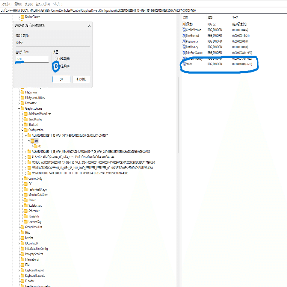 コンピューター\HKEY_LOCAL_MACHINE\SYSTEM\CurrentControlSet\Control\GraphicsDrivers\Configurationメインモニターレジストリ内にStrideがないので作成していく↓