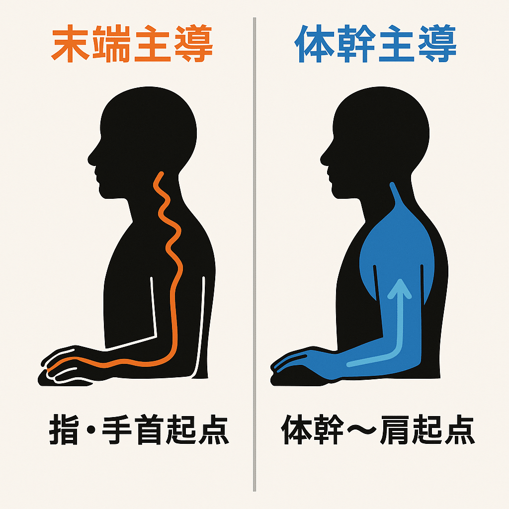 これは、支点に近いほど微細な動きを制御しやすいという物理的な原理に基づいています(これすごくムズイ、逆にやりにくいって人もいると思う。そもそも環境で支点にする体幹がみんなバラバラだから難しい。そこから【椅子机の高さ肩幅もろもろ】ジョイントできるならいいと思うけど)