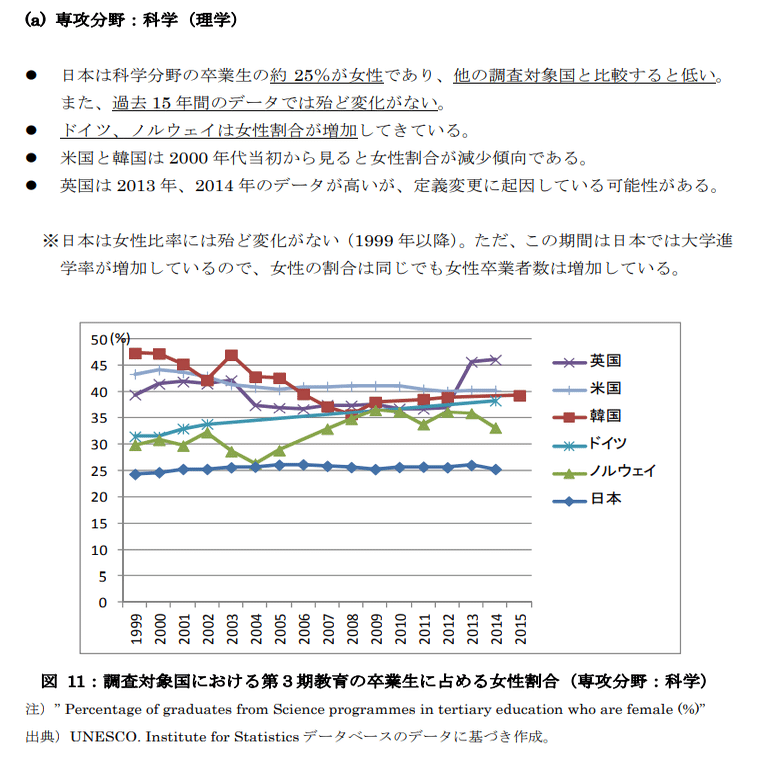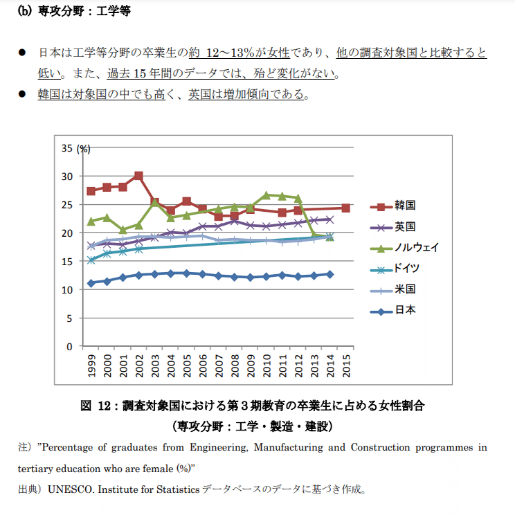 しかしサマーズ自身が述べているように彼の発言には根拠がある。例えば内閣府男女共同参画局の資料によれば、米国において大学生の男女比は大体4:6=女性が多いが、卒業生における女性の割合は理学が40%(女性卒業生全体の25%)、工学が20%(女性全体の12%)と散々な結果だ。