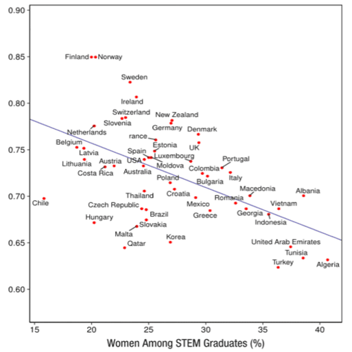また青少年の科学、数学、読書の成績に関する国際データベース ( N = 472,242) を分析した結果、国家的な男女平等が進むにつれて学力や理系学位の取得の程度における性差が増加したことが示された。以下の図は横軸が理系(科学・技術・工学・数学)の学位を持った女性が全体を占める割合で、縦軸が男女間の不均衡を示す世界男女格差指数を示すものであるが、男女平等先進国のフィンランド等の北欧国家で理系女子の割合が少なくなる1方で、逆に男女格差の大きいアルジェリアなどは理系女子の割合が高くなっている。これに関して研究者は「男女不平等な国だと女性は食いつながなくてはいけないので実用的な学問に進むが、男女平等な国だと女性は食いっぱぐれる心配がないので好きな分野に進む」と結論した。要は男女不平等だから理系に行かないのではなく、男女平等だから興味がない理系に行かなくなるのだ。良い悪いは別にして日本の芸大・美大の男女比が著しく女性に偏る理由もコレで説明出来ると思われる。
