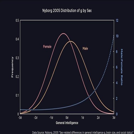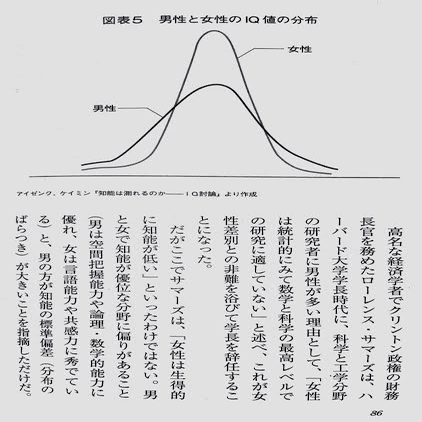 以上のデータから理系に関する志向や適性はある程度の男女差はあると考えるほうが自然だろう。そしてIQの男女差についてよく持ち出されるのが以下の図である。
