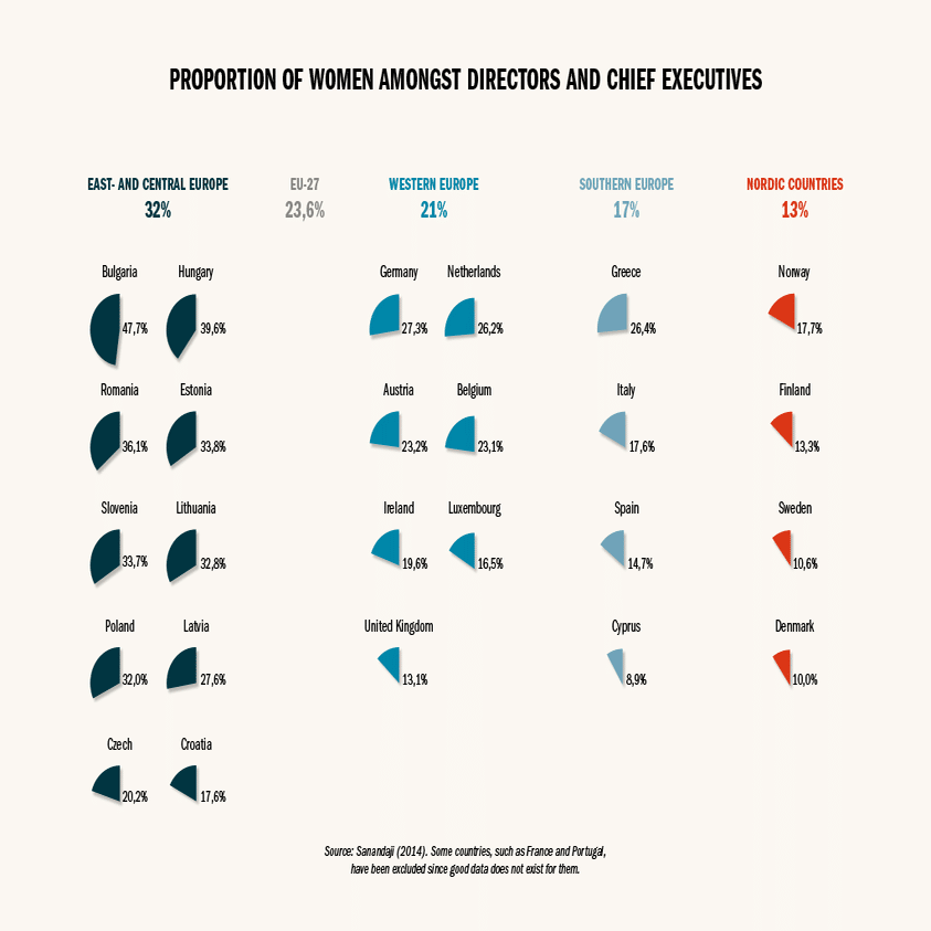 実際にIQや理系志向だけではなく性格や嗜好においてですら「男女平等になるほど性差が大きくなる」ことが示唆されている。例えばリーダーシップについて所謂フェミニスト政策(feminist policies)を行う国家ほど指導的立場につく女性が少ない傾向がみられ、例えば男女平等超先進国である北欧諸国においてジェンダー基準がより平等な国ほど上級管理職の女性の割合が高くない傾向にある事が指摘されている。具体的には男女平等後進国とされる東欧および中央ヨーロッパの民間企業の取締役および最高経営責任者の32%は女性であるが、男女平等超先進国と名高い北欧諸国では13%である。