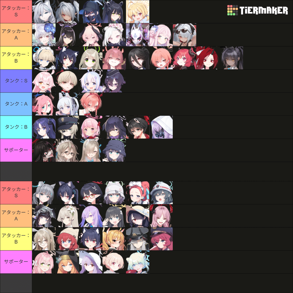 S:文句なしの最強生徒、Sにいる生徒だけで編成が組めるほど汎用性が高く且つ強力。誰を育成するか迷った場合、この生徒達から選べばまず間違いない。左右差強め。